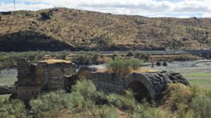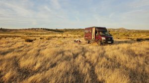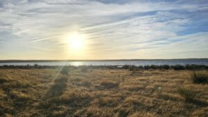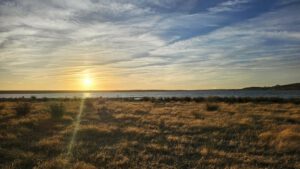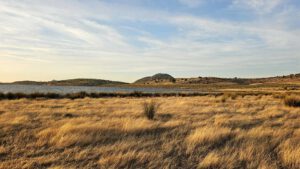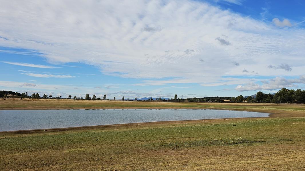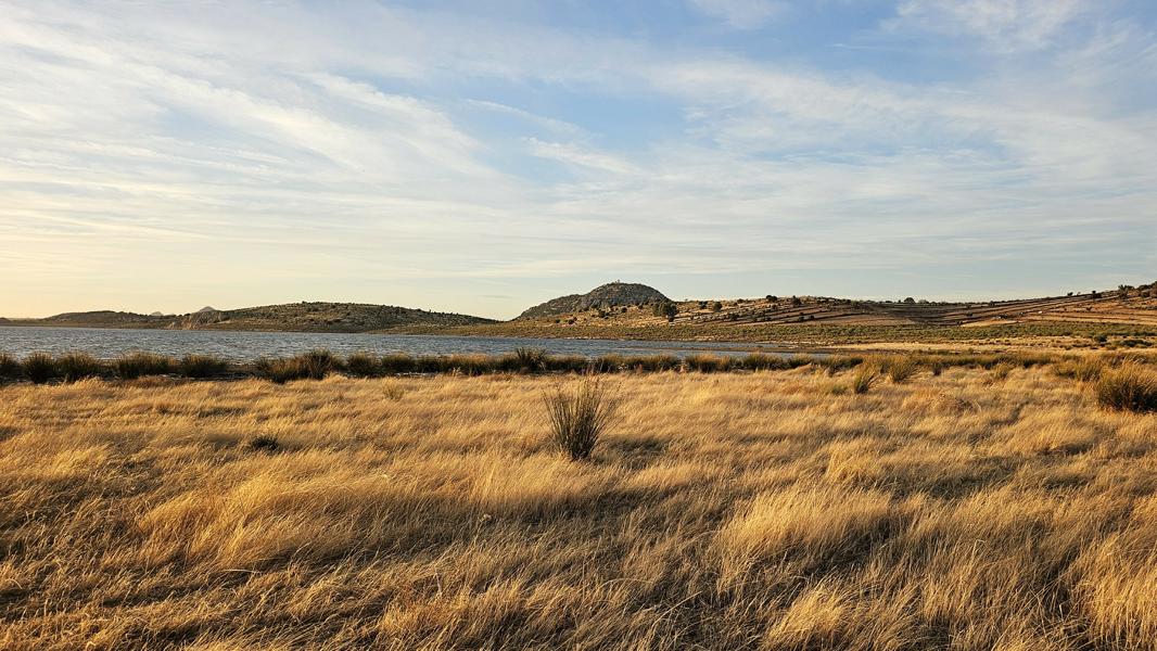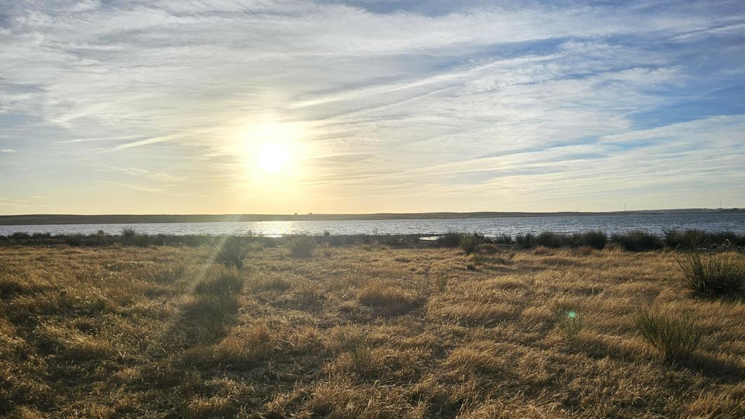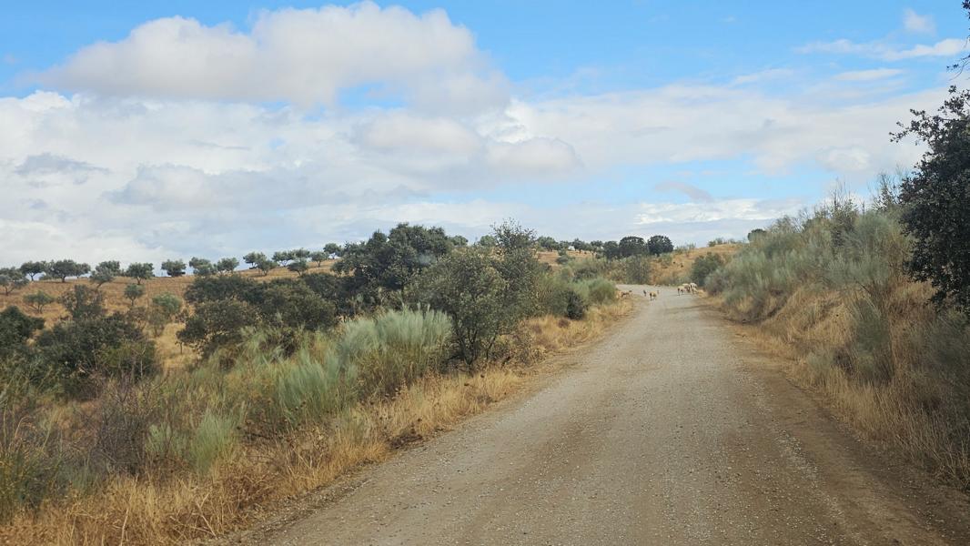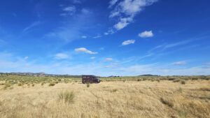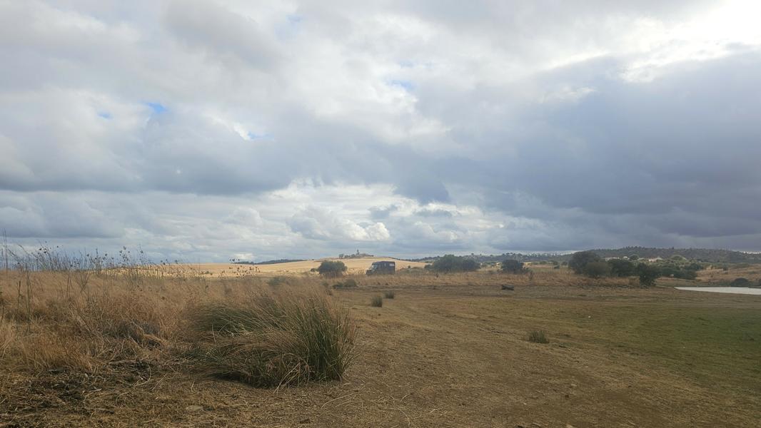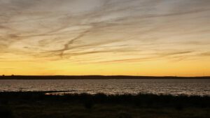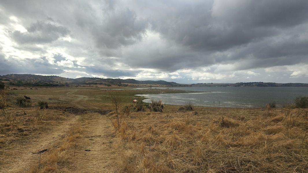 Der Alange-See zu dem ich weit runterrumpeln kann erwartet mich schon und auch seine kleinen Minifliegen, die nix tun, aber später am Abend das Womodach in ein schwarzweiß sprenkeln. Sie mögen mein Küchenlicht und kommen mühelos durch die Fliegengitter. Ich stehe wunderbar im gelben Gras bei herrlichem Sonnenuntergang. Ich könnte länger bleiben, aber mein Date in Portugal steht. Also zurück über eine nicht sichtbare Grenze und dann nur bis hierher zu diesem Guadina-See.