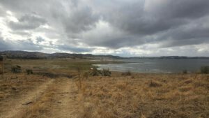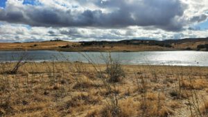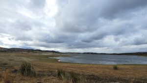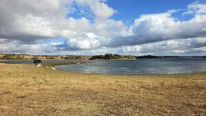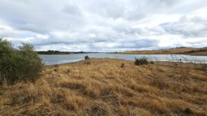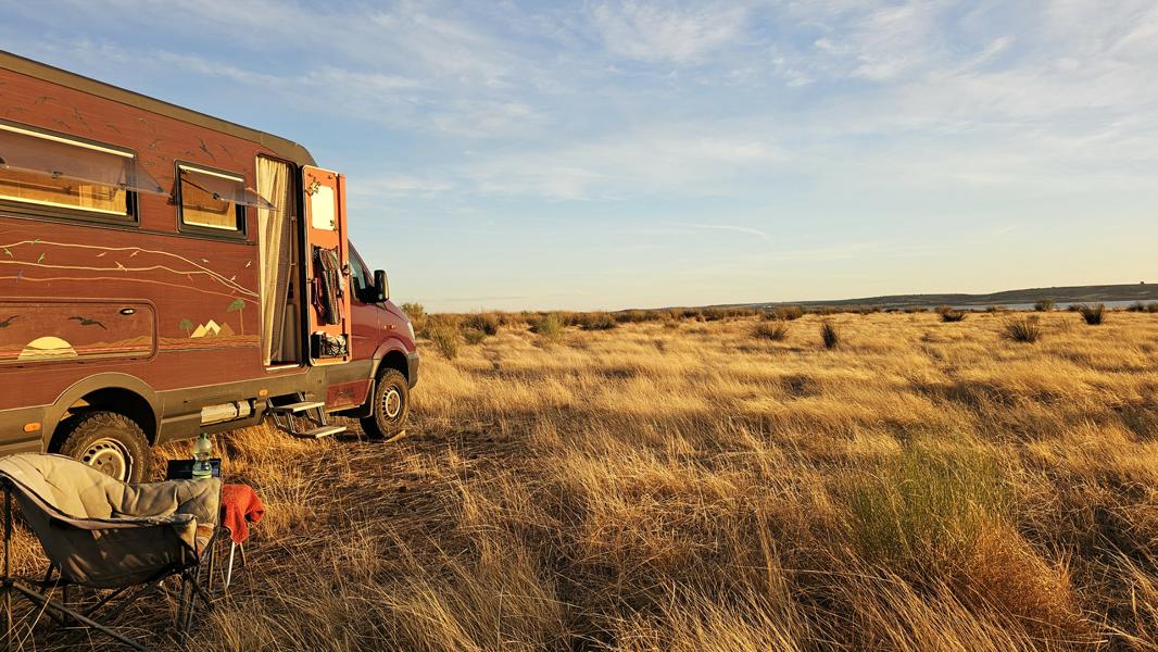 Hier war ich schon mal und auch der blaue Kastenwagen stand damals schon unten mit seinen vielen blauen Wasserflaschen. Der scheint fast hier zu wohnen. Ich stehe abseits, ein bißchen windgeschützt mit Blick zu beiden Seiten über diesen großen See. Wie ein Nomade, der mit seiner Herde zu seinen guten Plätzen wandert, schnurrt Brummeli dahin. Es ist schon verrückt und ich staune immer wieder, das ich sie für eine Zeit bewohnen darf.