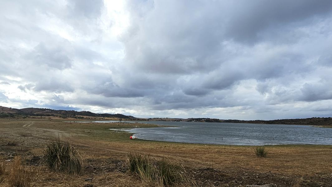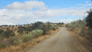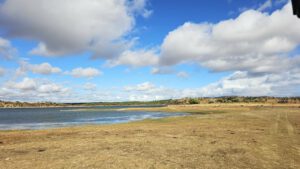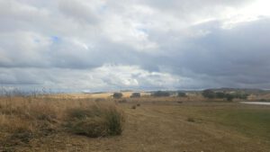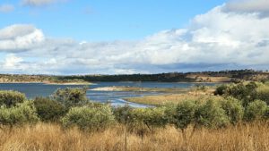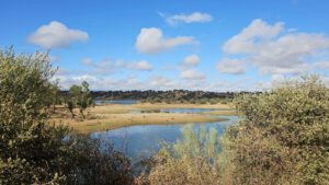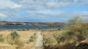 Mal wieder, wie so ein guter Freund sagte, ein running-gag, ein wunderschöner Morgen mit leisem Seegeplätscher, Vogelgezwitscher und einer Sonne, die sich müht, ein Wolkenloch zu scheinen. Es riecht nach Heu und Kräutern. Vor mir Weite, hinter mir Weite und nur ein Hund, der in noch weiterer Ferne ein bißchen bellt. Die Kühe schlafen noch. Angekommen in Portugal an diesem großen weitverzweigten See bei Reguengos de Monzaras, der eigentlich der Grenzfluß Guadina ist.