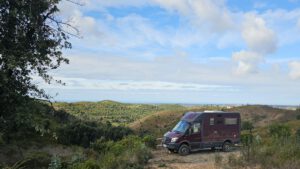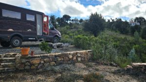 Angekommen in der Portugalwelt. Hier bleibe ich jetzt bis so ungefähr Mitte November und kümmere mich. Und wenn der Nordostwind nicht zu stark wird, kann ich hier gut stehen und auch ein bißchen meinen Kram erledigen. Vielleicht mache ich noch eine Windschutzerfindung. Leben präsentiert mir gerade diesen Platz von seiner zuckersüßesten Seite. Und am Abend gibt es Grillenkonzert und das rufende Käuzchen. So eine schöne Stille hier oben.