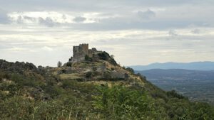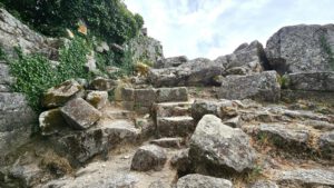 Ein bißchen hinauf auf den Hügel zur Burg gekraxelt. Ein paar neue Steine erzählen von Renovierungsversuchen und die Alten von vergangenen Zeiten, in den die Horden von irgendwo die anderen Horden jagten. Menschleins flohen auf die Burg, die nicht so leicht erreichbar war. Weiter unten ein Gotteshaus und der Friedhof.