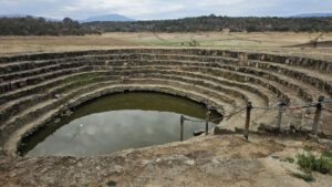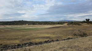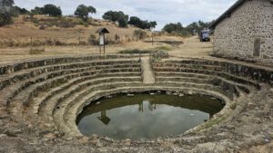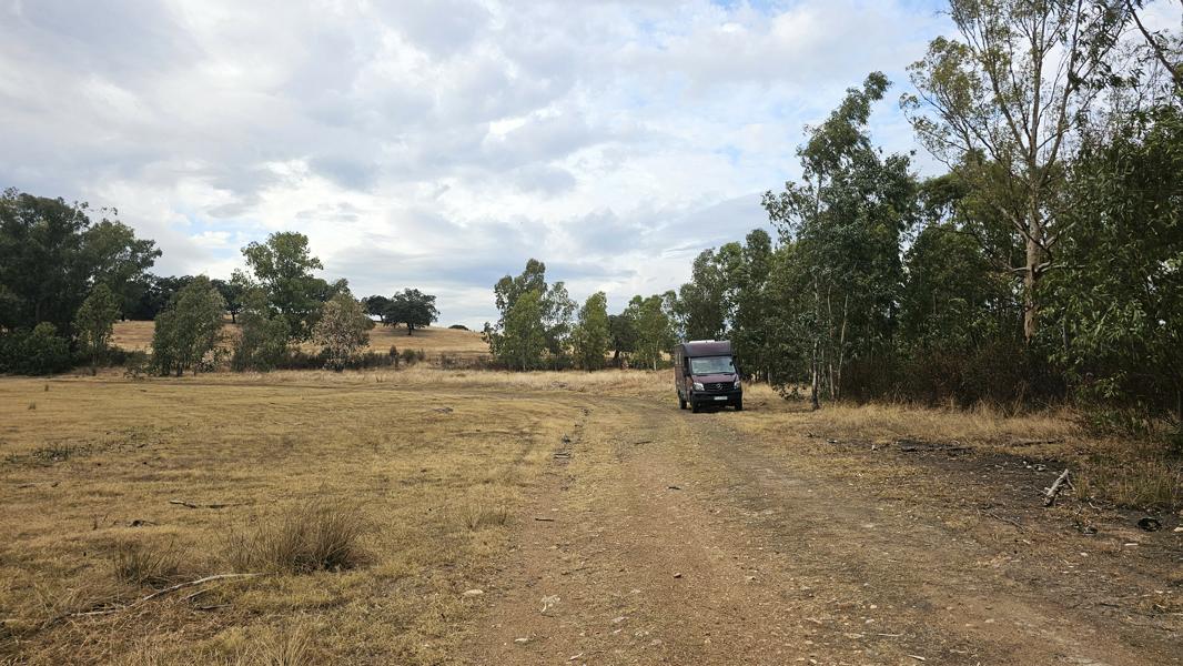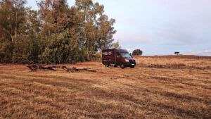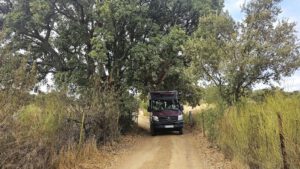 Zurück in die Normalität. Da gibt es noch ein „Schlammbad“, Bano de la Cochina, das ich mir anschauen will. Kreisrund wie ein Amphittheater und eine Steintreppe hinein. Heilschlamm, so erzählt die Legende und viele Menschleins kommen hierher, suhlen sich im Schlamm und kommen ohne Auas wieder raus. Ich finde es gerade nicht so einladend und gehe nur eine ehrfürchige Runde drumherum. Brummeli hatte es da etwas schwieriger. Ein schmaler Feldweg mit ein paar kratzigen Büschen. Der großen mächtigen Korkeiche haben sie aber einen Ast gekappt. So passt Brummeli drunter.