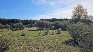 Ein Sandpfad, fest ausgefahren schlängelt sich durch die Bäume. Der schönste Platz von einem alten Bulli mit langhaarigen Bewohnern eingenommen. Auf dem zweitschönsten wohnen die Bienen und auf dem Dritten lande ich. Brummeli windet sich um den Baum und der Fluß liegt im schönen Abendlicht vor mir. Vorsichtshalber aktiviere ich meinen Mückenstecker. So bleibt mir unnötige Kratzerei in der Nacht erspart.