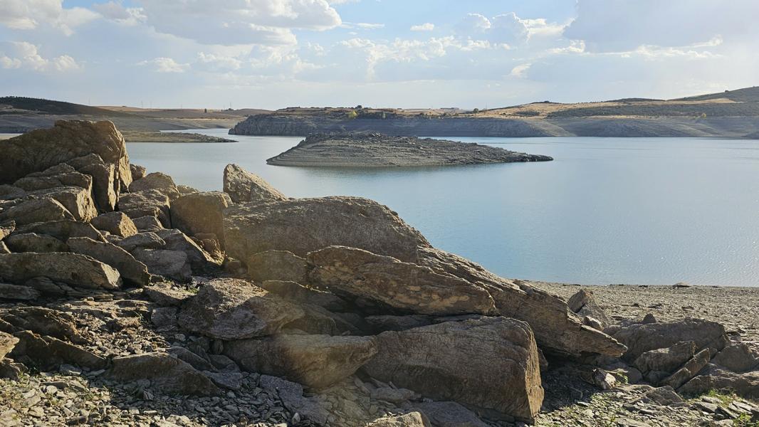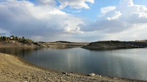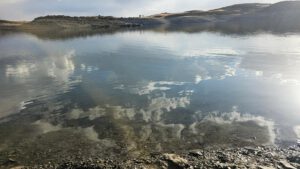 Ein bißchen das Land zu Fuß erforschen. Weiter hinten auf dem Hügel ein paar Häuser, am Ende ein Bootsclub. Gegenüber „parkt“ das Auto der Fischer in Schräglage auf den Querrillen vom ehemaligen Wasserstand. Felsige Steine und hinunter über meine „Querrillen “ zum Wasser. Das ist ja überhaupt nicht kalt. Kein Menschlein da und die, auf der anderen Seite sind hinter der Kurve verschwunden. Ein tolles Schwimmerli wartet auf mich, auch wenn ich nix dabei habe. Es ist kühl, aber angenehm. Die Sonne scheint so warm herunter das ich schnell auf dem Stein trockne. Nur meine Schuhe bleiben nass. Auch die trocknen irgendwann mal.