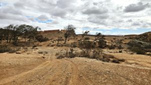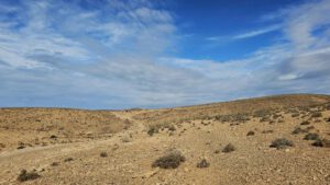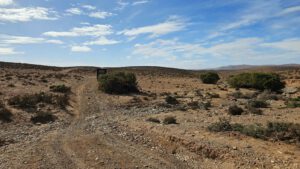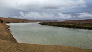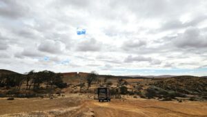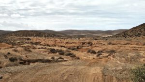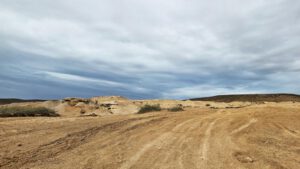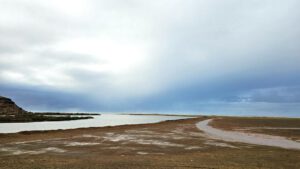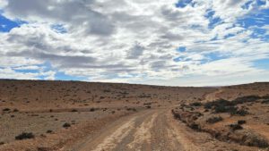 Das Wadi ist trocken. Kein Wasser mehr in diesem Fluß. Die Wolken werden dunkel und dunkler. Wo ist denn ein gutes Plätzchen für Sauwetter? Hinter Guelmin an der heißen Quelle oder doch einmal Plage Blanche. Ich entscheide mich für letzteres. Die Piste zur heißen Quelle bei Regen ist nicht ganz so toll. Schmieriger Lehm! Ein kurzer Gang auf dem Pfad hinunter zum Meer, der auch schon glitschig, glibberig glänzt. Auch zu Fuß komme ich nicht weit,- zu rutschig.