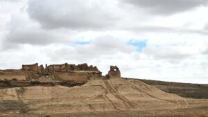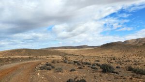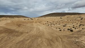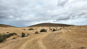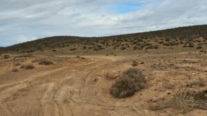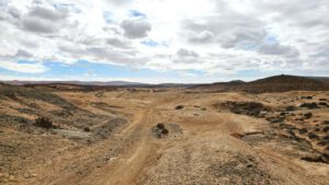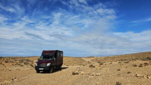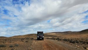 Brummeli rumpelt alles mit Bravour. Kurz vor dem Fort kommt dann ein sandiger, teils steilerer Wegabschnitt. Es schaut wunderbar aus und nur eine Ecke ist wirklich schwierig, weil die Schräglage ziemlich doll ist. Geradeaus wäre besser gewesen. Na gut, Brummeli meistert auch das, ohne irgendwie wegzurutschen. Und ich stehe auf diesem weißen Plateau, auf dem man auch gut übernachten könnte. Viele kommen hier nicht vorbei. Mittlerweile gibt es zwei Asphaltstraßen bis fast zum Fort und der nicht asphaltierte Teil ist breit und flach geschoben.