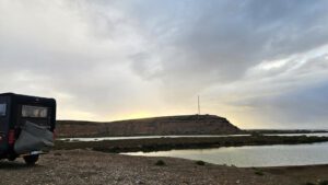 Noch hängen ein paar Wolken in der kühlen Luft und der Pfad hinunter zum Meer glänzt matschig. Gewitter und Regenschauer bevölkerten Plage Blanche am Abend. Wir sind zu dritt. Böen fetzen das Meer entlang und es flimmert und flackert von Blitzen in der Ferne. Das habe ich richtig gemacht, denke ich noch. Bei Sauwetter irgendwo im Schlamm, – nein danke. So baue ich mich am frühen Abend hier oben an der Plage Blanche auf. Regen fetzt übers Land und ich stehe auf sicherem Grund.