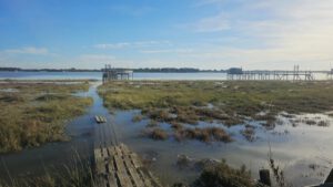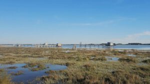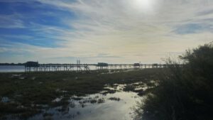 Erst schau ich noch beim anderen Platz vorbei. Nicht ganz so lauschig und vor allem niedrig. Wenn die Flut kommt, könnte es nass werden. Ich wandere noch die beiden Wege entlang. Aber es gibt nur Nischen für die Fischerautos, die dann auf ihren Stegen hinüber zu ihren Angelhaken wandern. Also zurück und meine beiden Engländer sind auch wieder da Ein nettes Hallo. Tshirts baumeln im Wind und in Nullkommanix sind sie trocken. Ich habe Bürodienst bevor ich es mir jetzt wieder am frühen Abend gemütlich mache.