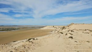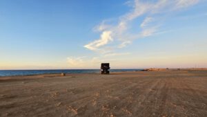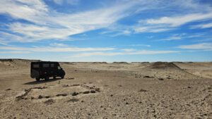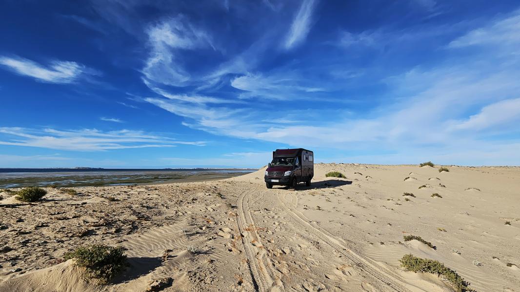 Wir ratschen ein bißchen miteinander. Für mich ein zur Not-Platz (viel zu nah an Zivilisation) und für ihn ein Zuhauseplatz. In seiner kleinen „Raumkapsel“ so bezeichnet er sein Womo fühlt er sich zusammen mit seiner Frau sehr geborgen. Will fast gar nicht mehr raus. Da bin ich anders. Erzähl ihm noch von der weißen Düne.