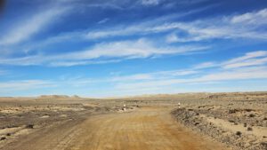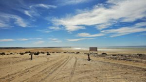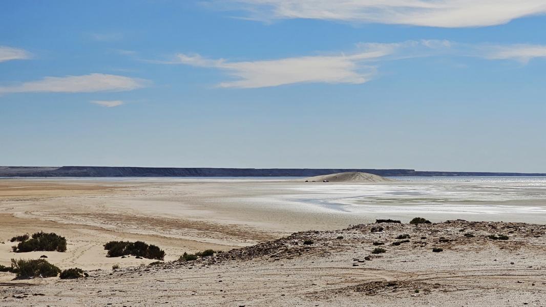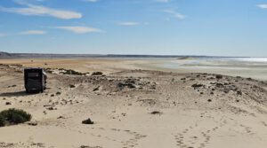 Ganz bin ich ja nicht hingekommen, aber doch sehr, sehr nah. Wie schade, superschade das wir um fünf weggeschickt werden. Diskussionen unmöglich. Ich stand hoch oben an der Klipppe, schaute hinunter in die Lagune und weit hinten zur großen Düne, die bei Ebbe zu Fuß erreichbar ist. Die Piste geht gleich am Anfang der Straße nach Dakhla links weg. Eine Waschbrettpiste, holprig mit ein paar sandigen Stellen, die aber mühelos zu durchfahren sind. Auch ganz am Ende Sand. Mit Schwung hindurch und dann der Einkehrschwung auf „meinen“ Platz. Weiter vorne ein Italiener. Auch er hat sich für die Nacht eingerichtet und später kommt noch ein Pössl.