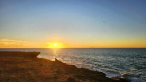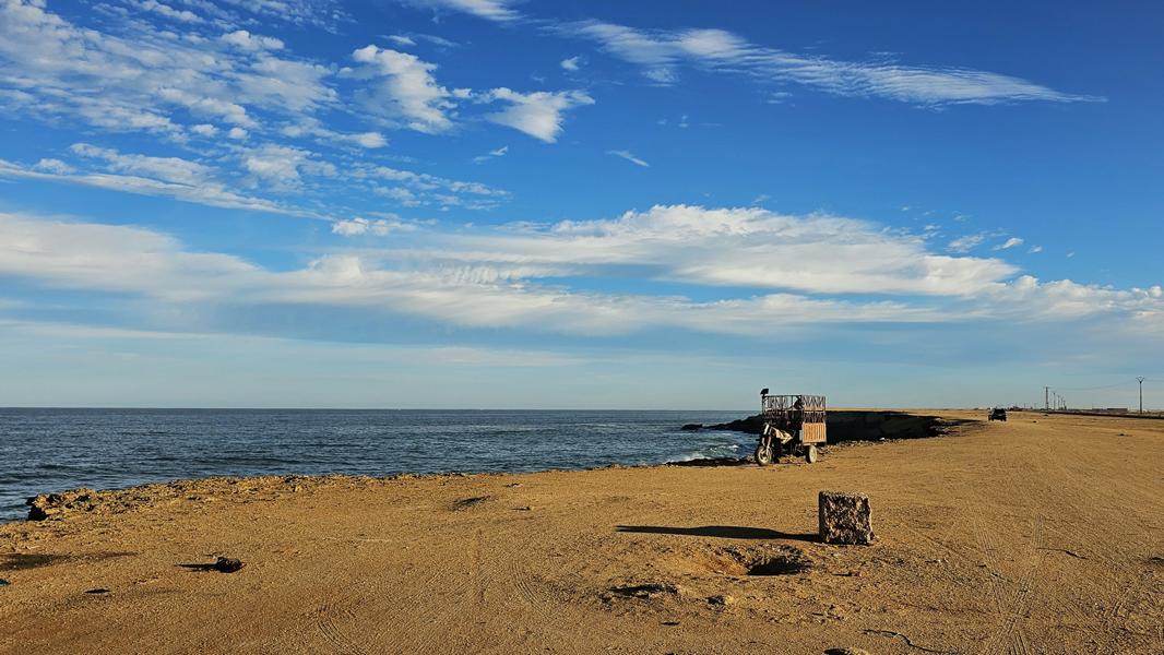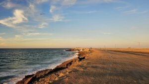 Ganz, ganz am hintersten Ende von Dakhla, der Landzunge, die ins Meer ragt, wache ich auf. Sonne im Rücken und die Shilouette von Dakhla. Ein paar Fischer mit ihren Angeln, die sie weit hinunter ins Meer hängen. Nur noch ganz wenige Autos sind auf dieser Straße unterwegs und ich schlafe mit den Wellen des Meeres. Abends kommen zwei sehr nette Militärs, fotografieren die Pässe und wünschen eine gute Nacht. Auf meinem sonstigen rote-Erde-Meer-Platz wurde die Nacht vorher jemand weggeschickt. Mitten in der Nacht. Das riskiere ich nicht und hier steht schon ein anderer Deutscher eine ganze Woche. So lauschig ist es nicht, aber er fühlt sich wohl hier.