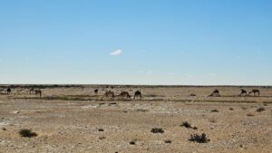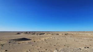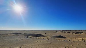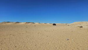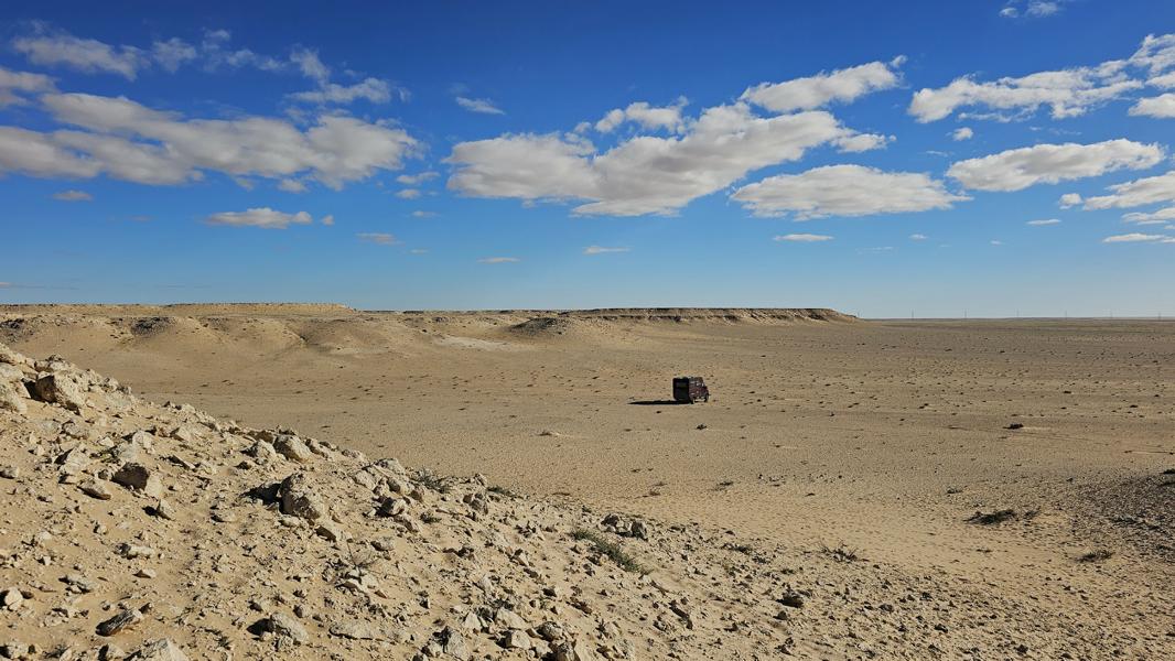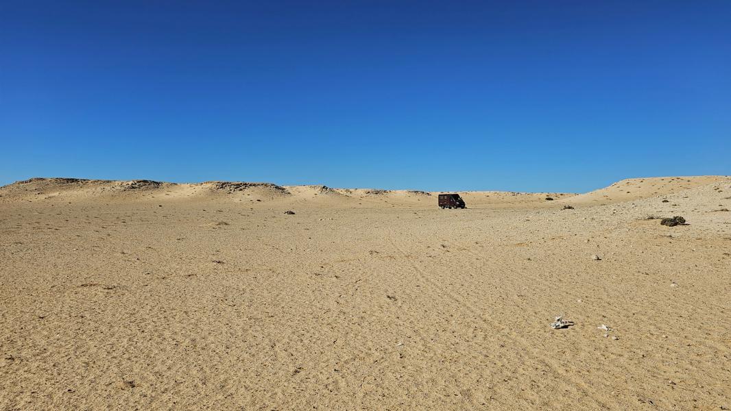 Zu Fuß weiter auf die Hügel zu der einen und anderen Seite. Käme ich da mit Brummeli irgendwie hin? Die Sandfelder sind zu weich. Von gnz oben schau ich fast bis zum Meer. Zwei Nomaden kommen mich besuchen, Vater mit Kind. Die Turnschuhe sind zu groß für ihn. Wenigstens ein paar Bonbons. Dann ziehen sie von dannen. Irgendwo in der Ferne hatte ich weiße Nomadenzelte am Anfang der Straße gesehen. Wahrscheinlich gehören sie dahin.
