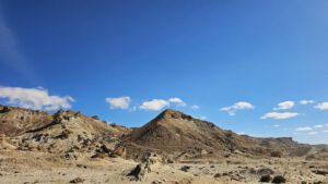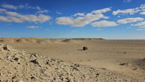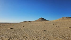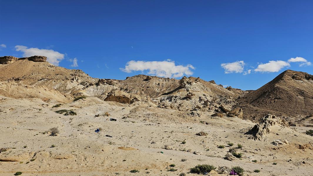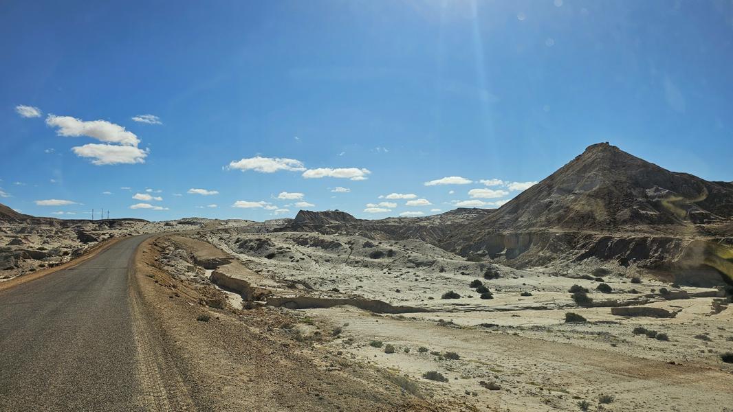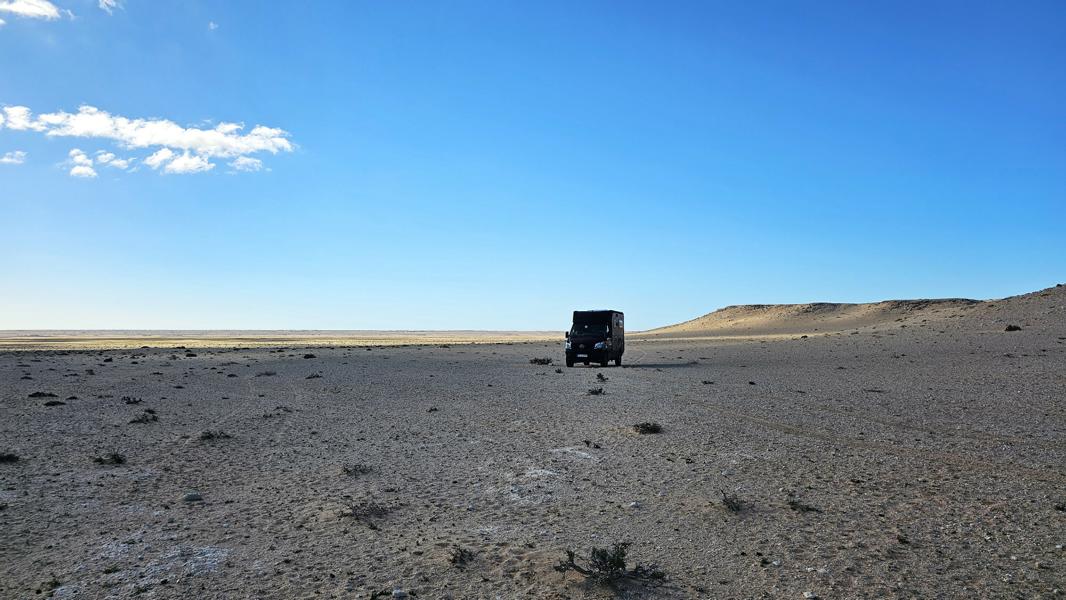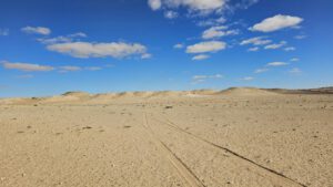Da fahre ich doch lieber abseits Richtung meiner weißen Berge auf windiger Piste. Hier war ich schon mal und habe mich irgendwo zwischen den Sand-und Schotterhügeln verkrümmelt.