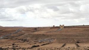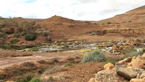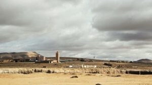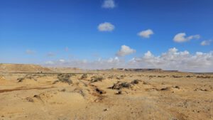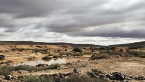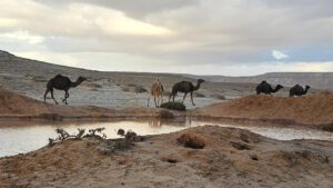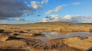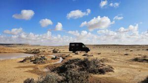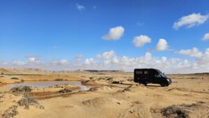 Da stehe ich wieder mittendrin in der sandigfesten Wüste in der Nähe einer Oase am Qued Chbika. Hinterhalb wohnt ein Ziegenbauer und die Kamele kommen abends zum Trinken. Eine tolle Szenerie. Dieses Wasserloch gab es beim letzten Mal noch nicht. Da war es knochentrocken und ich hatte hinter mir eine Staubfahne. Durch den vielen Regen ist es nass, auch hier in der Wüste. Das ist, glaube ich, das erste Mal, das ich hier Regen erlebe. Also passe ich bei lehmigmatschigen Passagen auf. Es geht aber, der Sand und feinkörnige Kies überwiegen. Es ist total still, ruhig und dunkel. Noch ein paar Sternleins in der Nacht, bevor am Morgen Regentropfen meine Fenster und Wolken den Himmel bevölkern. Ein kleines bißchen schmierig die Piste, aber nicht wirklich glitschig.