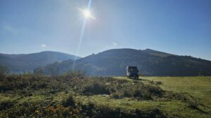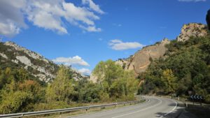 Und da habe ich mir doch das Meer in den Kopf gesetzt. Ich wußte eigentlich, das es schwierig wird, Plätze zu finden, jedenfalls solche wo man auch nahe dem Meer ist und es sieht, dazu bitte noch Weite und keine Zäune. Oh jeeh da waren mal wieder meine Ansprüche ziemlich groß. Es ist irgendein Feiertag in Spanien aber die großen Geschäfte, Mercadona und Lidl sind offen. Ein bißchen Milch, ein bißchen Obst, ein bißchen Salat und Wasser, dann bin ich wieder draußen. Durch wunderschöne Berggegend, teilweise enge Schluchten, dann wieder Almwiesen gondel ich Richtung Pechon. Die Häuser werden mehr, die Dörfer schön hergerichtet und Menschleins flanieren hier und dort. Der erste Platz ist doof. Kein Blick hinunter zum Meer, ein zugewachsener Picknicktisch und eine abgezäunte Almwiese. Ach nee, so schön ist das hier nicht. Weit und steil geht es hinunter zum Meer.