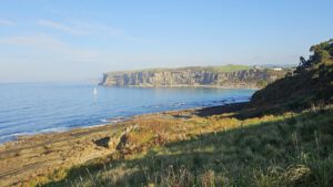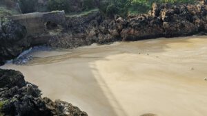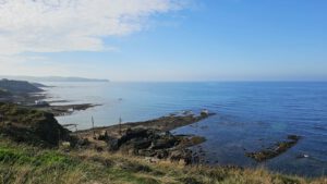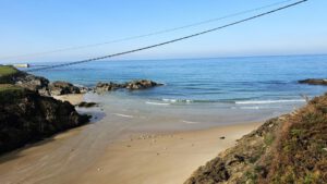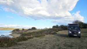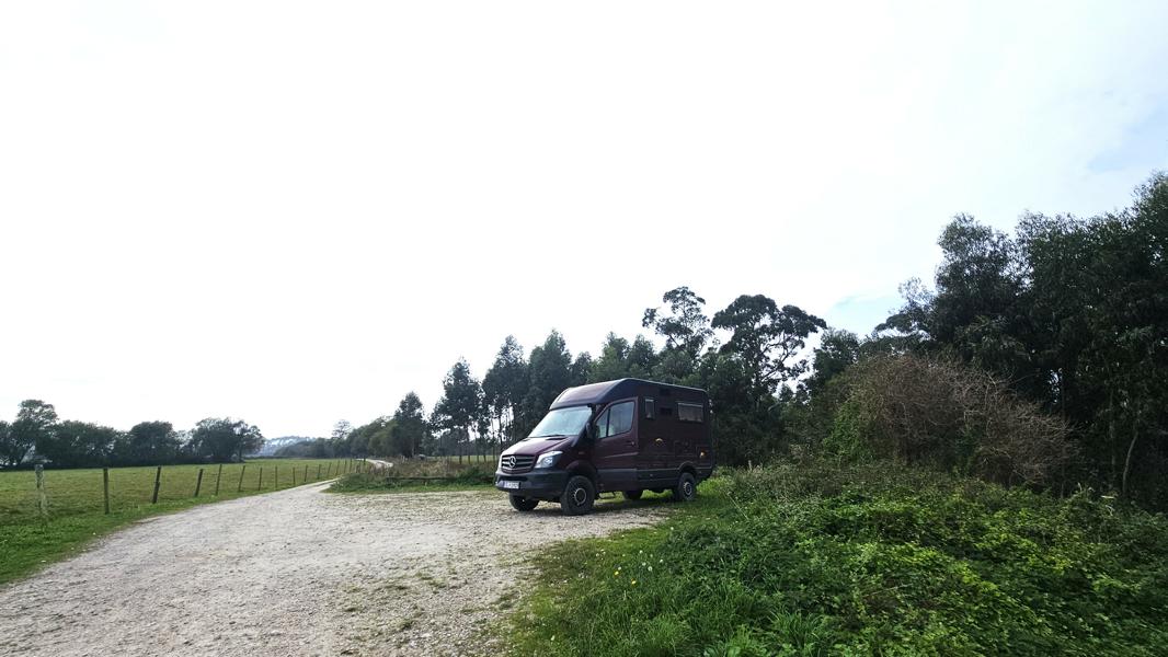 Es gibt noch einen anderen Parkplatz von dem ich meine, jetzt in der Nachsaison könnte ich bleiben. Schief und krumm aber mit Kufen müßte es gehen. Wunderbarer Blick aufs Meer. Aber von der anderen Seite der Bucht sieht man mich und ein Fischer, der etwas später kommt, warnt mich. Obwohl nirgends ein Schild steht, ist Übernachten verboten. Schade, ich wäre gerne geblieben, aber will nix riskieren. Tja der Atlantik, nicht ganz so einfach, das war auch in Frankreich schon so.