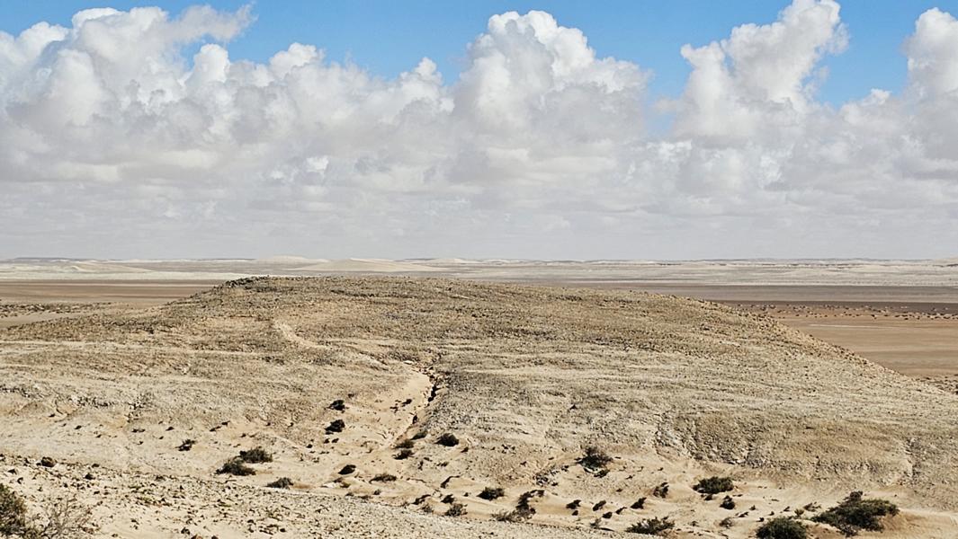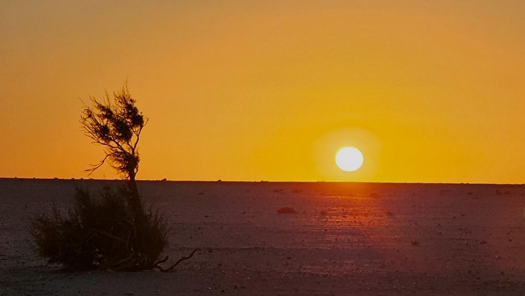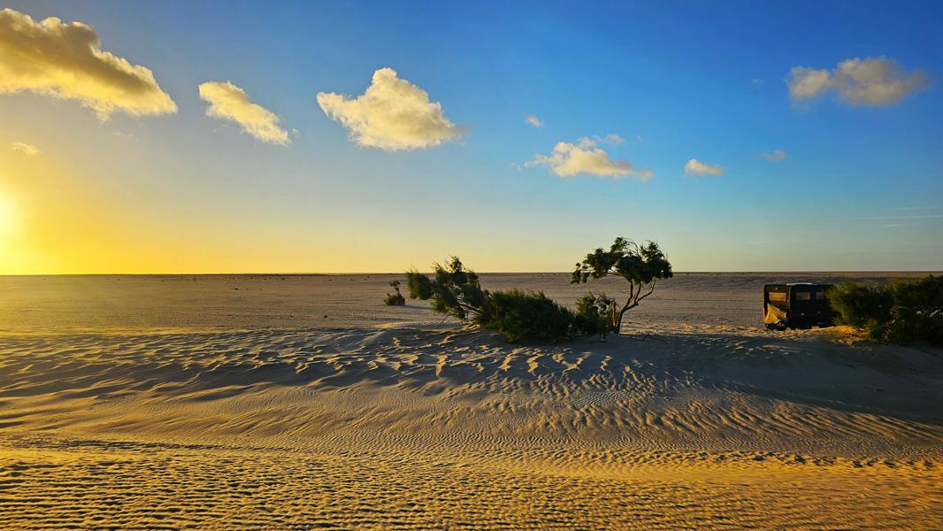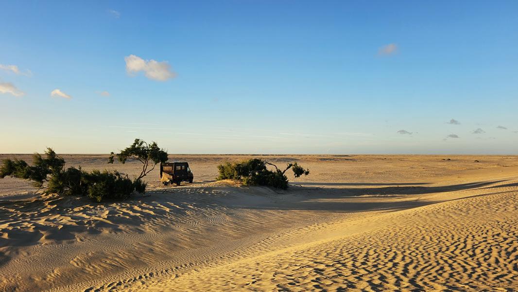 Erst bis zum grünen Rand. Rechts liegt ein ausgetrocknetes und versandenes Wadi. Die Spuren sind aber immer noch gut genug. Ich rolle weiter und noch weiter bis zu den Dünenbergen. Mei, ist das schön hier. Brummeli gesellt sich zu den beiden Bäumen, Face to the wind. Hinterhalb ist es still. Zu Fuß geht es weiter. In den nächsten Dünenbuchten ist es nicht wirklich weniger windig. Der Sand ist zwar fest genug, um reinzufahren, aber lauschiger ist es auch nicht. Ich bleibe bei meinen Bäumen.