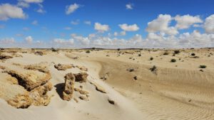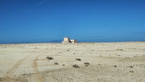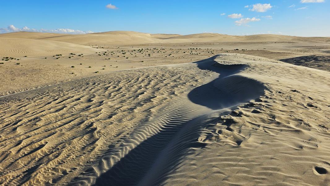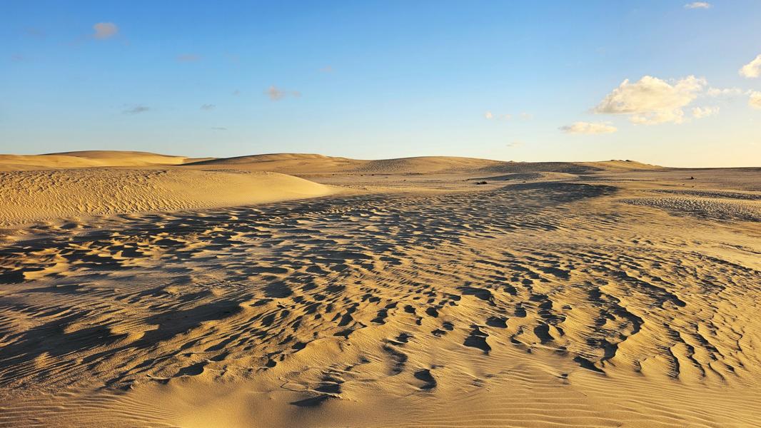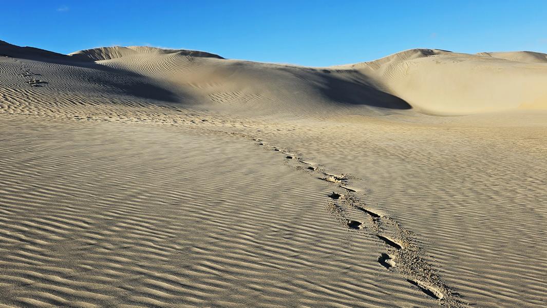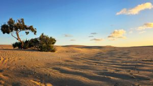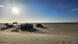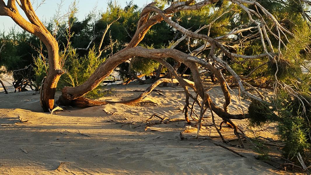 Aufwachen an Rande der weissen Dünen und zwei Krüppelgewächse als Orientierung. Der Wind huscht über mich hinweg und verweht langsam meine Fußstapfen im Sand. Brummelis Spuren bleiben sichtbar auf kiesigem Grund. Ein wunderbarer Platz. Eine Krähe begrüßt mich mit ihrem heiseren Kra-ka. Für einen Moment verweilt sie auf den grünen Zweigen, die noch aus dem Sand hervorragen. In nicht allzuweiter Ferne wird auch hier die Düne gewachsen sein und man kann vielleicht nur noch ahnen, das es einst Bäume gab. Der Sand holt sich das Terretorium zurück.