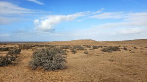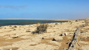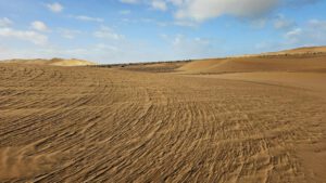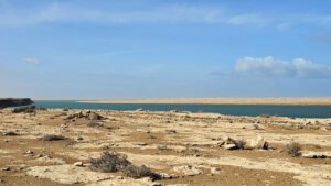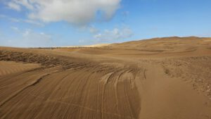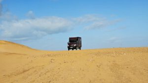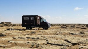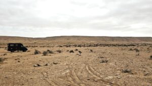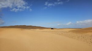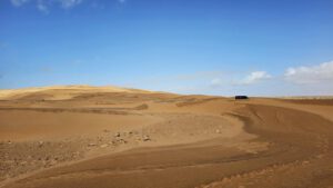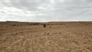 Oberhalb von Ahkfenir biege ich auf den Pistenweg Richtung Hügel ab. Gucke hier und da und lande noch etwas windig an einem Plateau. Ganz, ganz weit hinten das Meer. Es wackelt ein bißchen in der Nacht, aber nicht schlimm. Und weiter gehts von der Steinwüste zur Sandwüste.