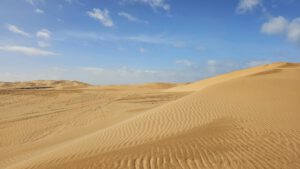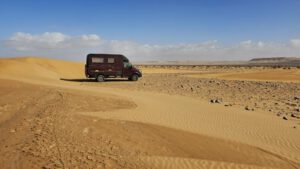 Ein herrlicher Platz hinter den Dünen, die jetzt von der Sonne angestrahlt neben mir leuchten. Der Wind legt sich schon in der Nacht, verhuscht sich in die Sandkuhlen und läßt mich ruhig schlafen. Das habe ich gut gemacht! Anstatt vorne an der Lagune von Khenfiss diesen heftigen Böen ausgesetzt zu sein, verkrümmel ich mich nach hinten in den Sand. Einfach nur herrlich! Der Weg ist zwar recht steinig, aber nicht versandet. Und ich steh wieder genau da, wo ich schon mal gestanden bin. Diesmal kein Hirte und keine Quads die, die Düne rauf und runter knarren. Und so lasse ich mir viel Zeit. Häng Träumen und Gedanken nach, die durch Astro intensiviert werden.