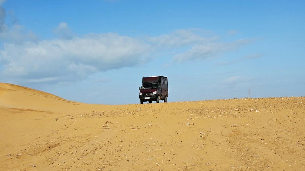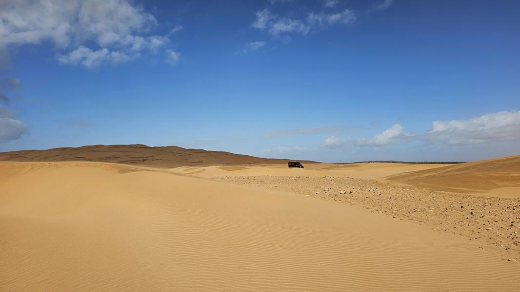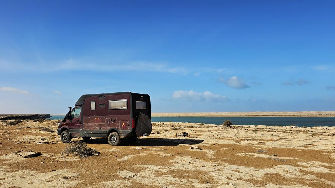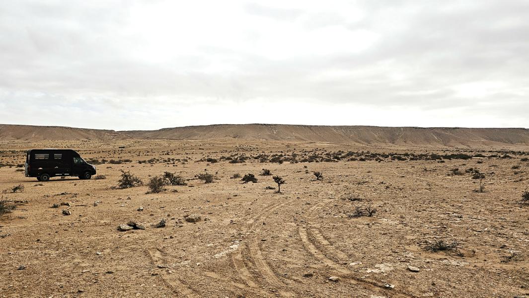 Oberhalb von Ahkfenir biege ich auf den Pistenweg Richtung Hügel ab. Gucke hier und da und lande noch etwas windig an einem Plateau. Ganz, ganz weit hinten das Meer. Es wackelt ein bißchen in der Nacht, aber nicht schlimm. Und weiter gehts von der Steinwüste zur Sandwüste.