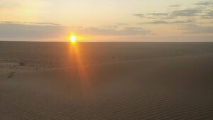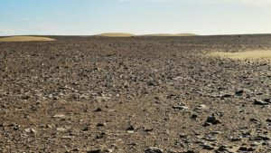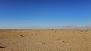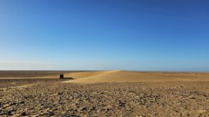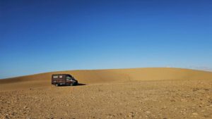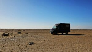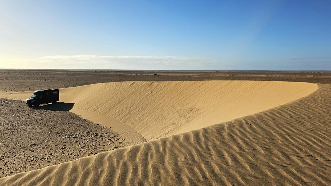 Was für ein herrlich stiller Platz im geborgenen Rund einer Sicheldüne. In der großen gelbrotbraunschwarzen steinigen Leere, erheben sie sich diese kleinen Dünen im Hintergrund. Querfeldein rumpelt Brummeli dort hin. Weit und breit nix ausser Steinen, flachen Felsgestein und Sand. Hier stehe ich vom Nordwind geschützt, weit weg von der Straße und ungesehen.