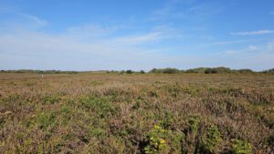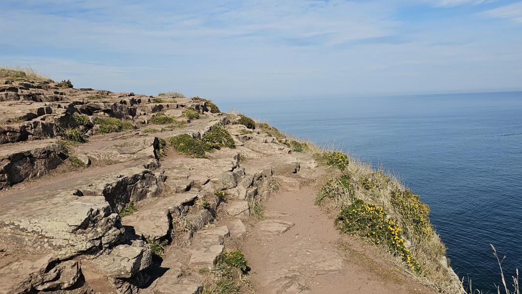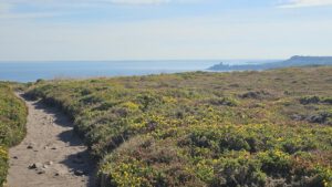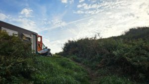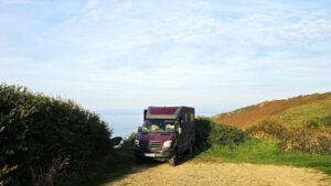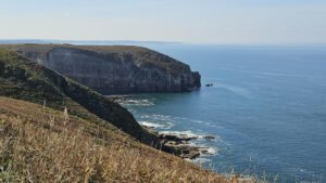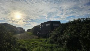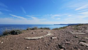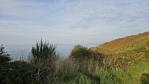 Noch scheint die Sonne zu mir herein, hier am Ende eines Schotterweges mit Blick zum schönen blauen Atlantik. Weit hinten sind ein paar Bauern aktiv und wollen wohl vor dem doofen Wochenendwetter ihre Feldarbeit erledigen. Trotzdem ein toller Platz direkt am Wanderweg G34. Vogelgezwitscher und ab und an ein bißchen Traktorlärm. Nachdem Wetterfrosch sich mal wieder nach unten Richtung warmen Kuschelnest im Womobauch verzieht, will ich den sonnigen Vormittag ausnützen, ein bißchen dieser Küste entlang zu laufen.