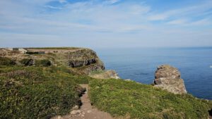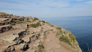 Ich finde einen herrlichen Fotografierpunkt am Wanderweg und habe keine Lust 8,50 für den Eintritt zu zahlen, genauso wenig wie die 5 Euro oben am Parkplatz beim Kap. Kurz überlege ich, ob ich das Radl den Wanderweg hinauf schieben soll und dann trotzdem radeln? Das ist mir dann aber doch zu mühselig. Der Weg ist schmal und viele Menschleins sind dort unterwegs. Also zurück und dann über die Straße hinüber Richtung Leuchtturm. Und dort geht es dann per pedes in einem großen Bogen drumherum mit wunderbaren Ausblicken aufs Meer. Ich lass mir Zeit, schau der Möwe beim Betteln zu und radel wieder zurück.