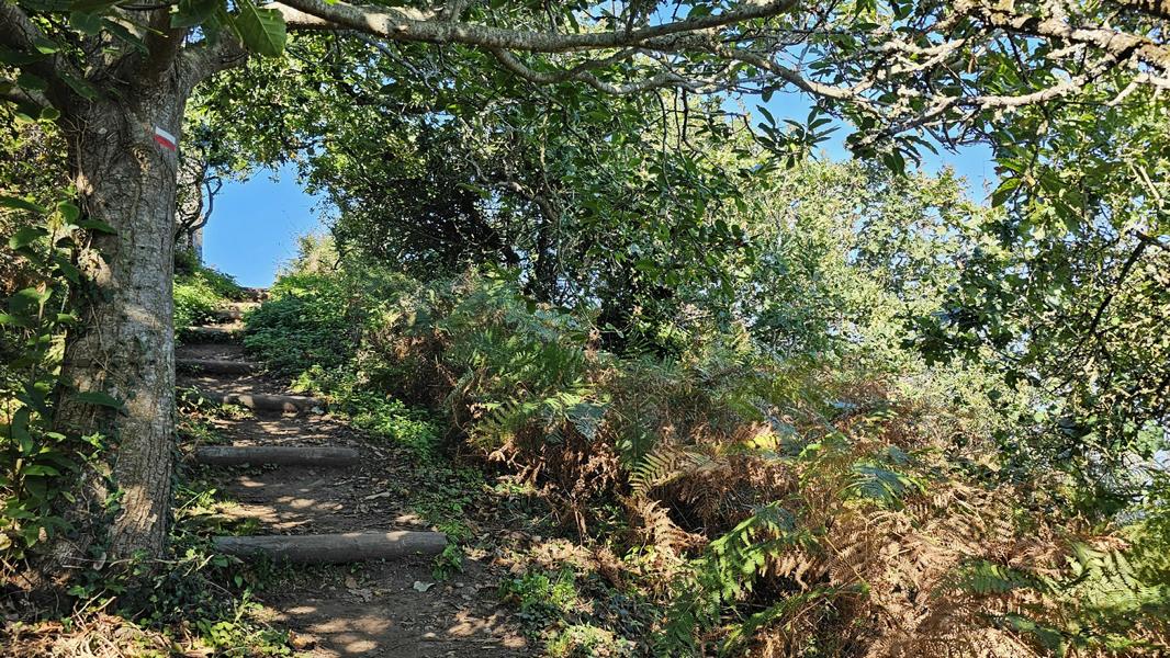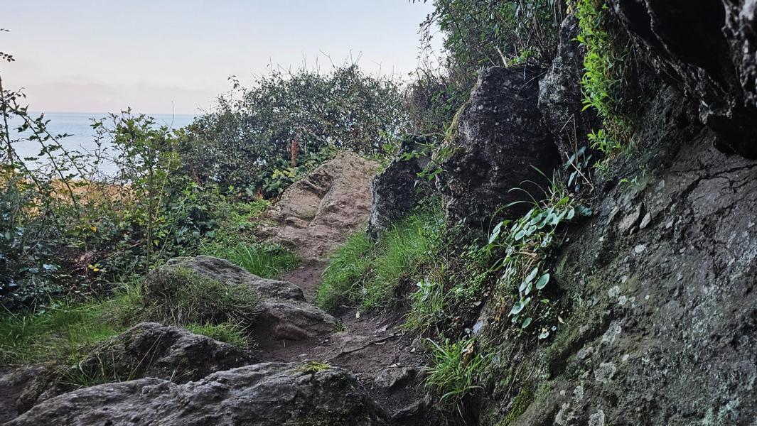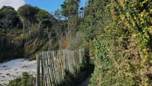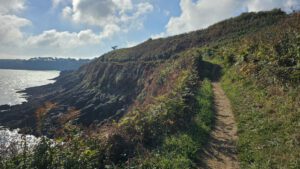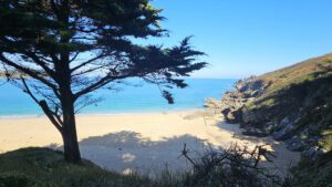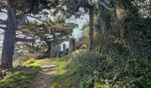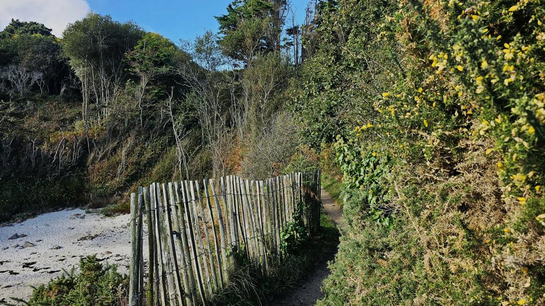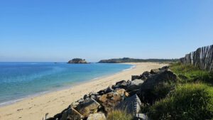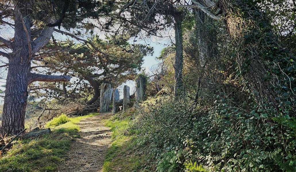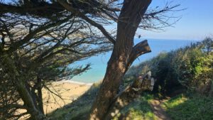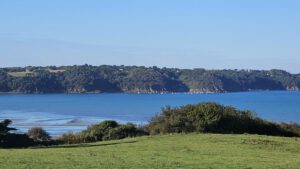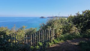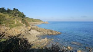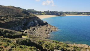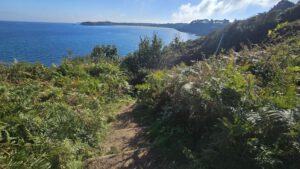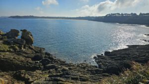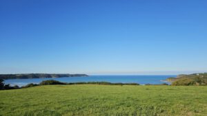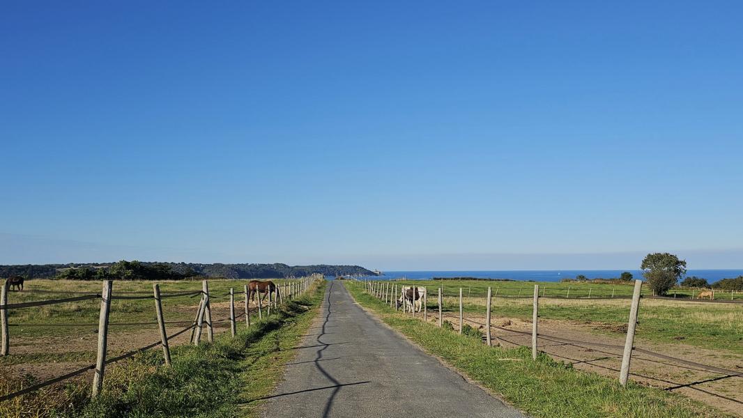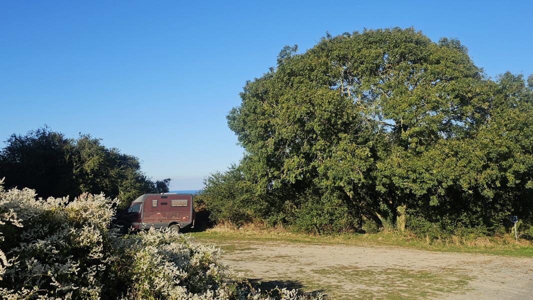 Hier ist es der große GR34 Wanderweg, der der Küstenlinie folgt. Ein paar Menschleins mit schweren Rucksäcken. Und so ist es schon früher Nachmittag, bevor es weitergeht. Weitläufige Pferdekoppeln und leider, leider darf ich nicht am Ende der Straße stehen. Für Autos über 5,5m verboten. So setze ich mich auf den Stein genieße den Weitblick bevor ich zu meiner Parknische zurückkehre. Zeit zum Telefonieren.