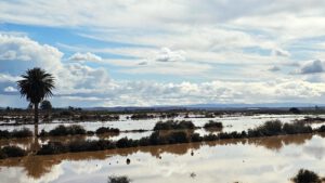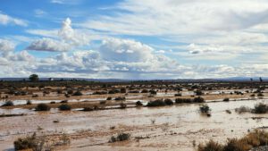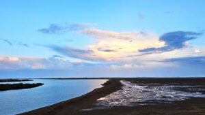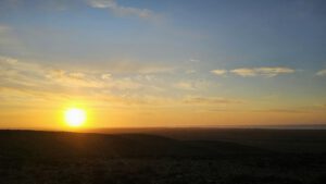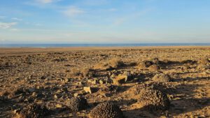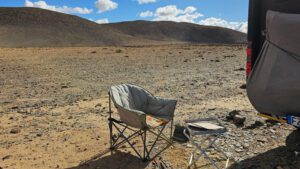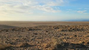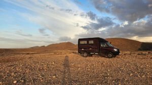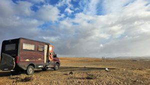 Und wenn ich so schaue, meint es Leben mal wieder so gut mit mir, – anstatt in einer verregneten Wüste zu stehen, bin ich am Meer irgendwo. Auch die Draa-Piste, die angedacht war, ist mit dem vielen Regen eine Schmierseifenlandschaft. Also stelle ich Brummeli auf eine weite braune körnige Nixlandschaft mit Weitblick über das Meer.