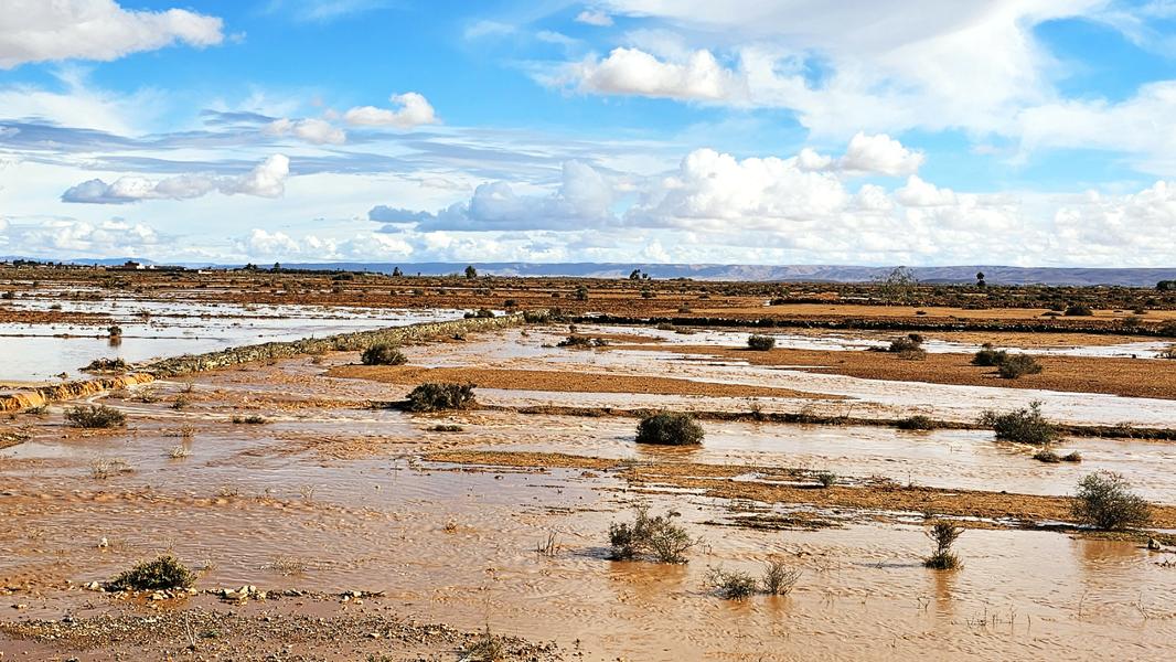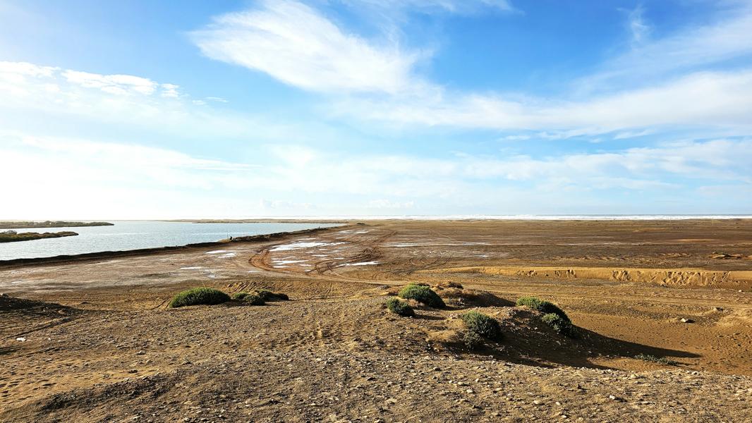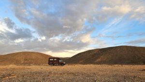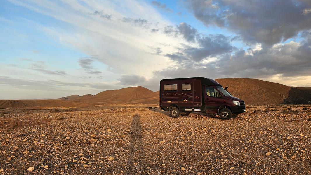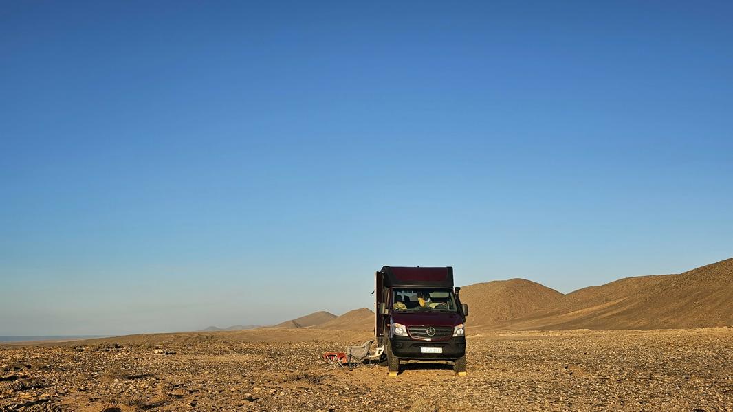 Und wenn ich so schaue, meint es Leben mal wieder so gut mit mir, – anstatt in einer verregneten Wüste zu stehen, bin ich am Meer irgendwo. Auch die Draa-Piste, die angedacht war, ist mit dem vielen Regen eine Schmierseifenlandschaft. Also stelle ich Brummeli auf eine weite braune körnige Nixlandschaft mit Weitblick über das Meer.