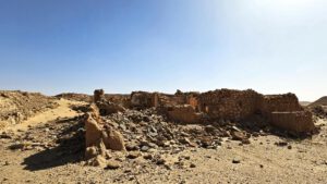 Eine Hügelkette und noch eine. Sandkörnchen in den Wolken über mir. Und gen Osten werden sie mehr. Hhhmmm, eigentlich viel zu schade, denn ich würde doch gerne die Umgebung sehen. Nach 30 Kilometer entscheide ich zurück zu fahren. Das muß ich bei schönem Wetter machen. Ein paar Pisten rechts und links werden noch ausprobiert. Alte Ruinen eines ehemaligen Dorfes erkundet, den Kamelen zu ihrem „Futtertrog“ gefolgt und die Weite erahnt.