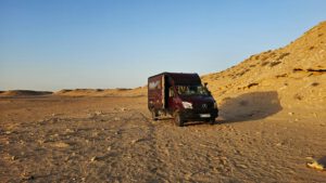 Sorgsam suche ich nach einer windgeschützten Ecke. Eng angekuschelt an den Berghang findet Brummeli seinen Platz. Der Wind hat die Sandkörner vertrieben und der Himmel ist wieder blau. Hier gibt es auch weniger Sand zum Aufwirbeln. Sternenklare Nacht und nur noch ein Fenster offen!