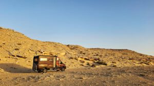 Sorgsam suche ich nach einer windgeschützten Ecke. Eng angekuschelt an den Berghang findet Brummeli seinen Platz. Der Wind hat die Sandkörner vertrieben und der Himmel ist wieder blau. Hier gibt es auch weniger Sand zum Aufwirbeln. Sternenklare Nacht und nur noch ein Fenster offen!