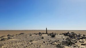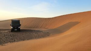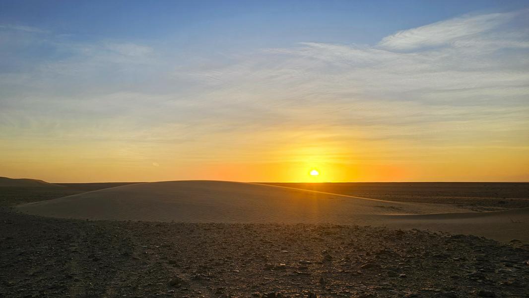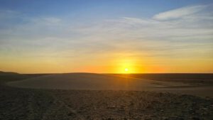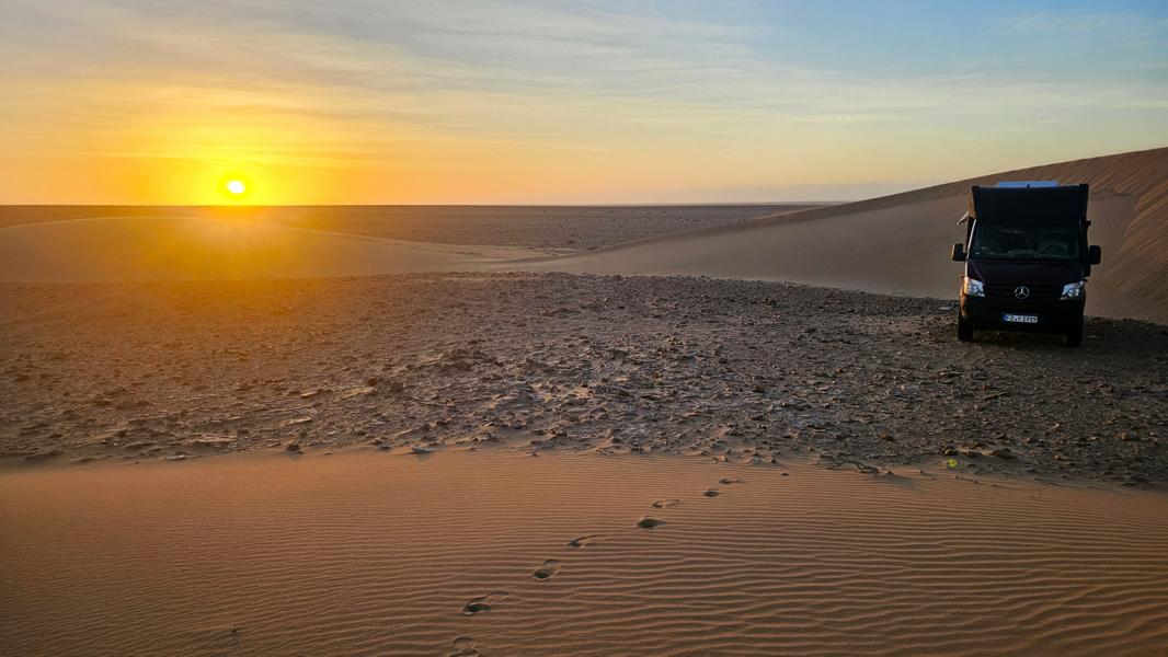 In einem Moment noch sternenklare Nacht und dann, – der letzte Stern sinkt herab in den Horizont und rutscht die Düne herunter. Sein Licht verbindet sich mit den kristallinen Sandkörnern, die langsam im Morgenlicht zu strahlen beginnen. Sternenlicht und Sonnenglanz für einen Moment im Zwielicht verbunden.