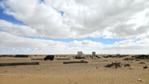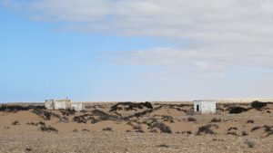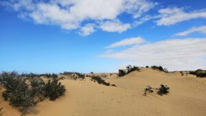 Meine goldgelbe Sicheldüne auf den schwarzen, kantigen Steinen erwacht mit dem Wind. Er huscht über die kleinen Körnchen und verteilt sie neu. So entstehen Wanderdünen. Und wenn ich lange genug hier stände? Am Abend bleibenTüre und Fenster offen. Kleine Sandverwehungen bedecken meinen Boden. Er kommt auch durch Moskitovorhänge. Wir sind doch klein genug, murmeln sie grinsend und verteilen sich auf Tisch und Bank. Ich verändere meinen Platz, damit ich der Düne nicht im Weg stehe.