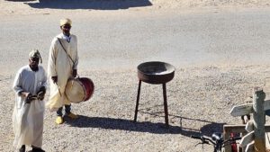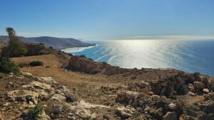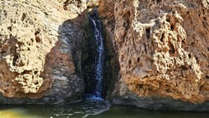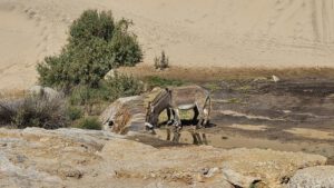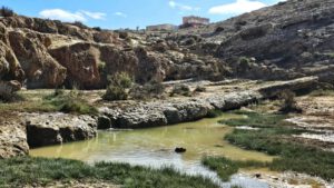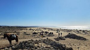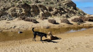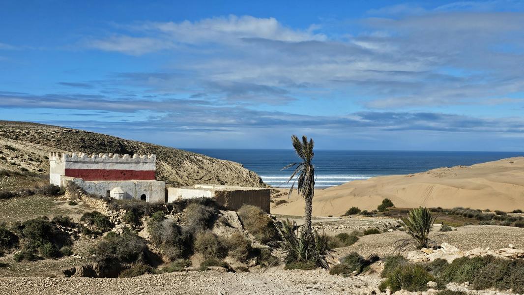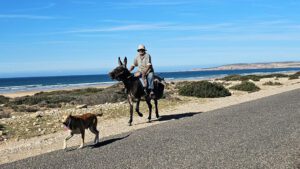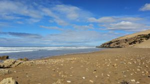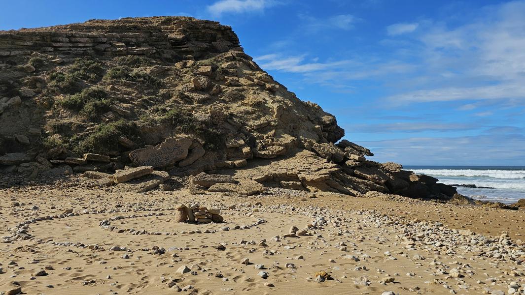 Weiter geht es wieder Richtung Agadir über die R 211. Teilweise schon sehr, sehr breit geschoben und dann hoch mit lockerem Kies aufgeschüttet, so dass Brummeli einfacher mit Allrad durchkommt. Nächstes Jahr wird hier sicherlich Asphalt sein. Erster Halt ist Sidi M’barak, eine alte Burgruine und weiter unten der kleine Wasserfall, der je nach Regen auch groß sein kann. Ich wandere hinunter. Esel trinken und Wasser plätschert lustig hinunter. Noch ein bißchen der Düne entlang. Hunde tollen übermütig umeinander, kommen zu mir her und laufen wieder weg. Unten am Strand ein Steinkreis. Da hat jemand Spaß gehabt.