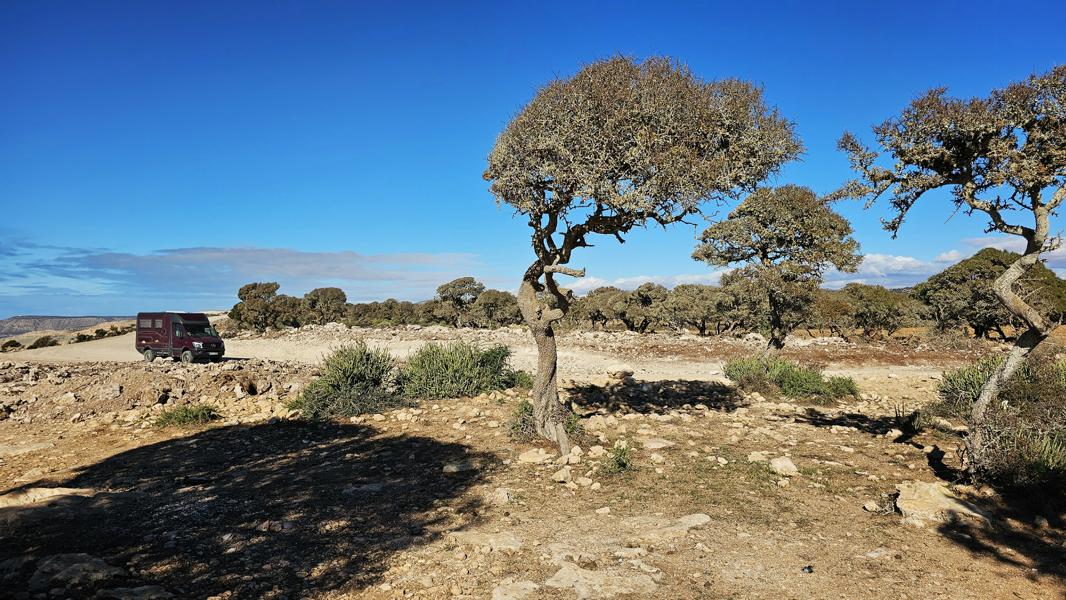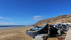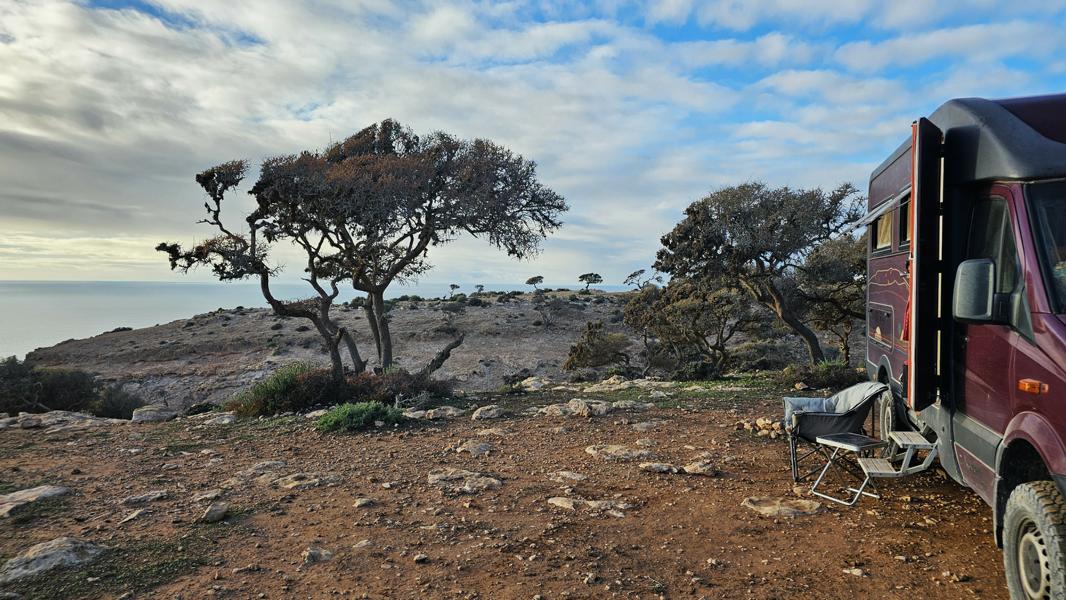 Zurück und weiter zum kleinen Fischerdorf Tafneda. Eng kuscheln die Boote auf dem Sand nebeneinander. Ein paar wenige Menschleins und die Fischerhäuser, die mich sehr ans Nordkap erinnern. Bunt nebeneinander. Ich rumpel die Piste hinauf Richtung R 211, über den lockeren Kies, bis ich zu meinem ehemaligen Platz komme. Der erste hat seine Lauschigkeit verloren, weil es nur noch ein enger Parkstreifen ist. Die Felder sind mit trockenen Sträuchern zugesperrt. Der zweite, ist nicht mehr erreichbar, weil durch den Straßenbau ein tiefer Graben entstanden ist. Ich entdecke aber eine Spur auf der ich zwischen den Arganbäumen hindurch bis zum Meer fahren kann.