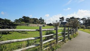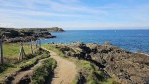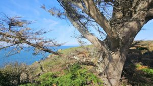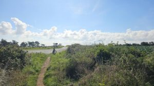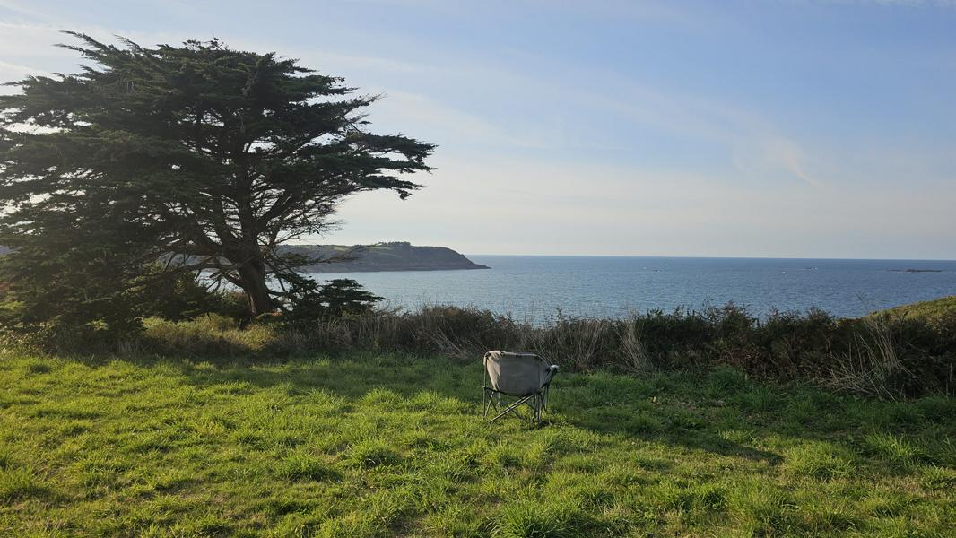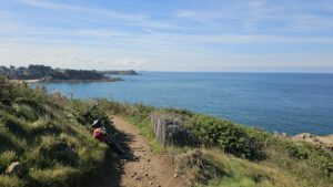 Weiter auf diesem Küstenwanderweg bis er zu schmal und steinig wird. Letztlich gibt es diesen Wanderweg die ganze Küste entlang. Eine tolle Idee und ich seh ein paar Menschleins mit Rucksack, die sich diesem Trail verschrieben haben. Im großen Bogen geht es wieder zurück. Die Abkürzung über Sand verschmähe ich dann doch. Bei Ebbe könnte man hier durch das Watt laufen. Es ist zwar Ebbe aber trotzdem. Zurück,- Stühlchen nahe dem Baum in die Sonne mit Blick auf Meer und Strand. Ein wunderschöner Sommertag!