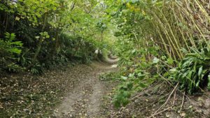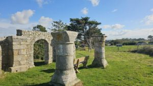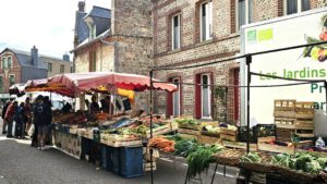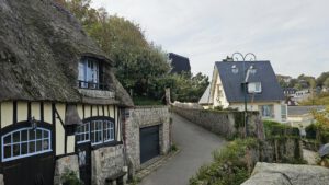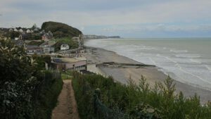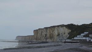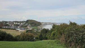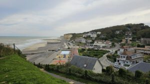 Ein bißchen gucken muß ich aber auch. Ein paar Kilometer zurück nach Veules-les-Roses. Da gibt es einen großen Parkplatz auf einer Wiese, auf der man in der Nebensaison sicherlich auch bleiben dürfte. Ich laufe hinunter zum Strand, zu den weißen Felsen und dem kleinen netten Ort. Es ist Markt mit allem was das Herz begehrt. Meine Kombüse ist noch gut genug gefüllt. Oberhalb des Dorfes steht ein Mahnmal der Alierten. Ich fotografiere es nicht. Laufe weiter zu den Resten einer jahrhundertalten Kirche und durch einen Hohlweg wieder zurück zum Brummeli. Ein kleiner netter normandischer Ort.
