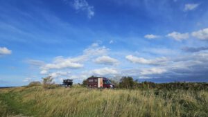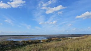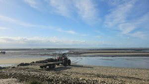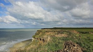 Weiter gehts, vorbei an Le Havre und seine große gebogene Brücke Richtung Caen und Bayeux. Hier haben die Austernfischer Hochkonjunktur. Mit Traktoren fahren sie durch die Sümpfe bis ans Meer. Nahe eines Bunkers stehe ich am Ende eines Feldweges. Für die Panzer war es einst nicht schwer hier an Land zu kommen. Wolken zieren noch den Himmel und das Licht kommt nur ein bißchen durch.