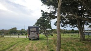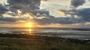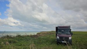 Guten Morgen, schon wieder ich. Kleine Regenschauer flitzen über mich hinweg und der Duft vom Muschel-und Algenstrand umwabert mich. Neben mir im gebührenden Abstand ein kleines Womo mit Aufstelldach. Sie waren zuerst hier und so baue ich mich am Beginn dieses kleinen Flecken Erdes auf. Ich bin in der Normandie, dort wo einst die Alierten anlandeten, um durchzumarschieren. Geschichtsträchtige Gegend. Ich habe aber keine Lust auf Krieg und Kriegsverherrlichung und lasse Bunker und Kanonen links liegen. Ob wir wohl über die Wirklichkeit des Geschehens, die Warums und Wiesos richtig aufgeklärt wurden? Der Sieger schreibt die Geschichte, ein Spruch, den ich schon immer wieder gehört habe.