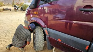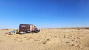 Davor verbringe ich einen Tag im Sand mit Wäsche-waschen, rumbummeln und Fenster putzen. Auch schaue ich erstmal selber nach der Waschanlage. Drei Tropfen kommen, aber nicht genug. Unten an den Behälter komme ich selber schlecht dran. Surfen nach Werkstätten und in Tiznit werde ich fündig. Da klopfe ich mal an.