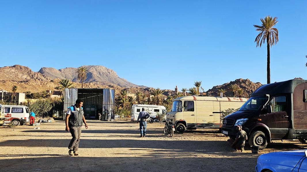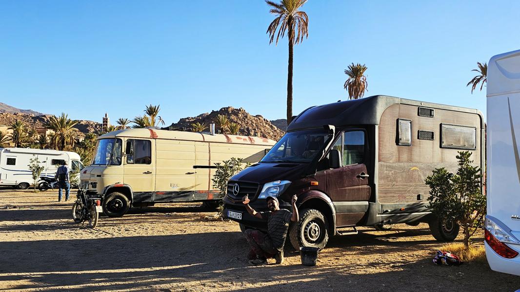 Holländer sind da,Belgier und ein Deutscher,- alle mehr oder weniger für Womo-Verschönerungsarbeiten oder sonstige Reparaturen. Und Vorher in Tiznit finde ich schon jemanden, der mir meine Waschanlage für vier Euro repariert. Der Auslass vom Tank zum Schlauch war verdreckt. Jetzt geht alles wieder gut. Und so schnurre ich durch die Berge über Berg und Tal, vorbei an den Siedlungen bis hierher. Nachmittags um halbvier bin ich da.