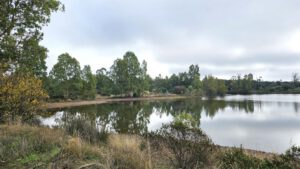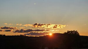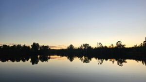 Weil ich erst so spät starte geht es gradlinig die Straßen entlang, keine Schnörkel. Bei Sonnenuntergang biege ich in Mina de Sao Domingos auf die Piste zum See ab. Zwei Womos stehen vorne auf dem offiziellen Stellplatz, hier hinten keiner. Das kleine Flüßchen, das bei vielem Regen die Furt überschwemmt war wohl ein Hindernis. Jetzt ist kaum noch Wasser, nur ein paar große Pfützen. Für Brummeli kein Thema.
