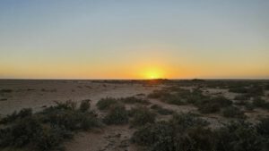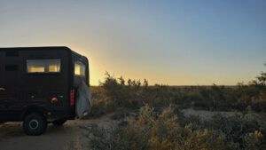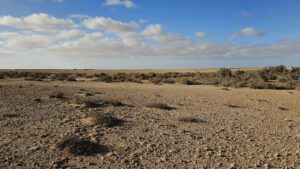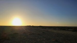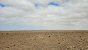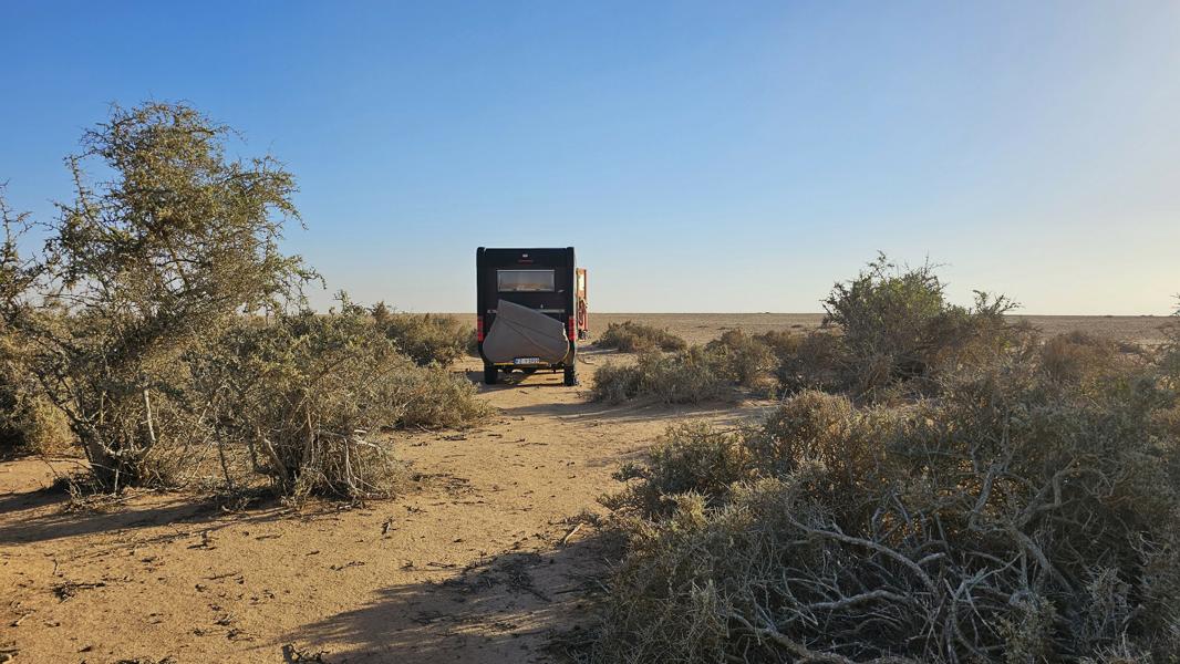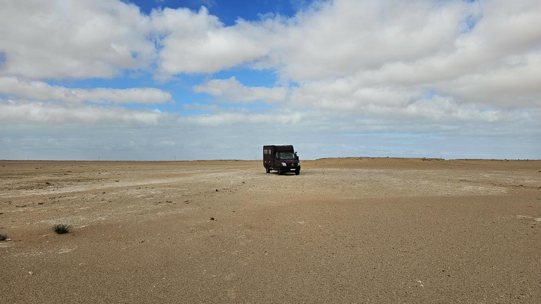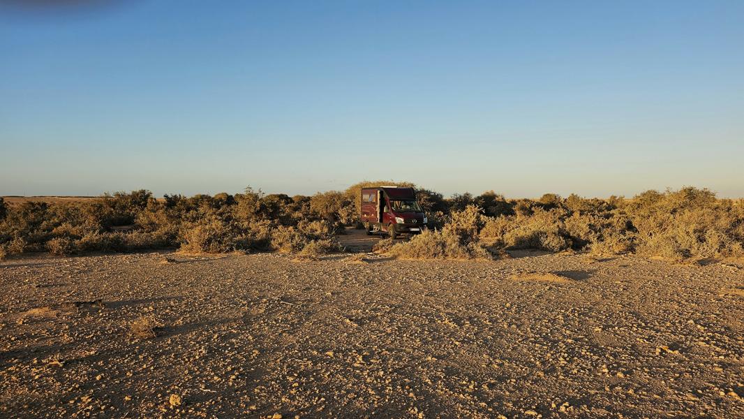Aufwachen mitten im Nirgendwo, oh wie ich das liebe! Ein paar kratzige Arganbüsche geben Windschutz. Vor mir steinige Weite und hinter mir steinige Weite. Nur ein schmales neues Asphaltband zieht sich durch. Hier am kleinen Wadi bleibe ich. Die Sonne war da und ist schon wieder in ein paar Wolken verschwunden. In der Nacht sternenklar! Das weiße Band der Milchstraße quer über den Himmels-Horizont. Lange sitze ich am Abend windgeschützt an der Tür von Brummeli und gucke zu den Sternen! Unendliche Weite da oben, noch viel unendlicher als hier unten bei den gröberen Sandkörnern.