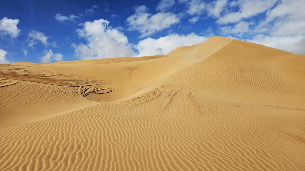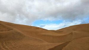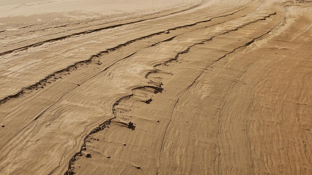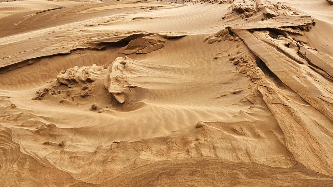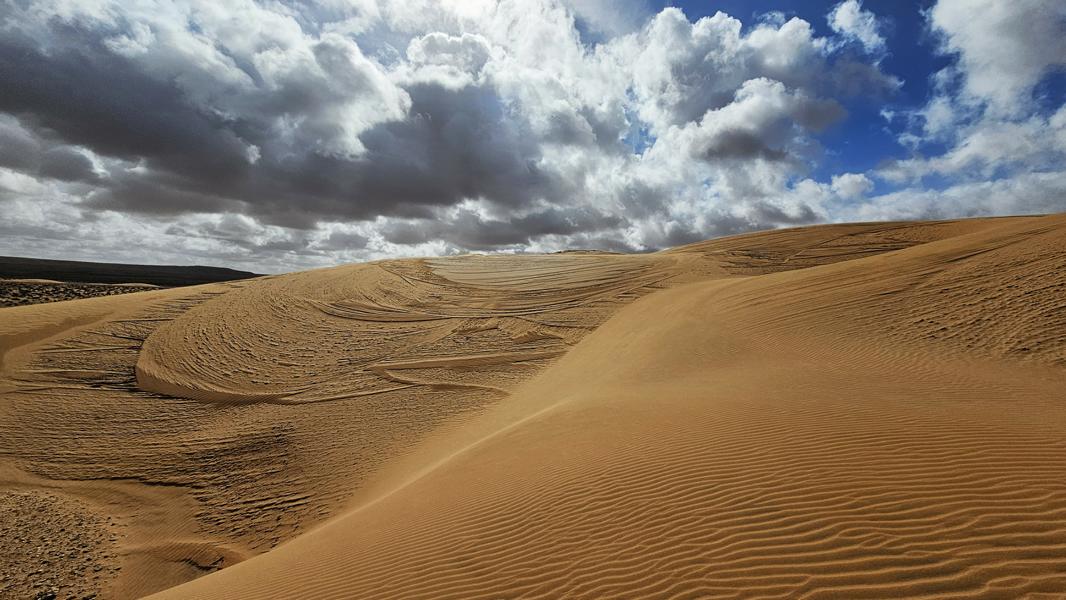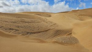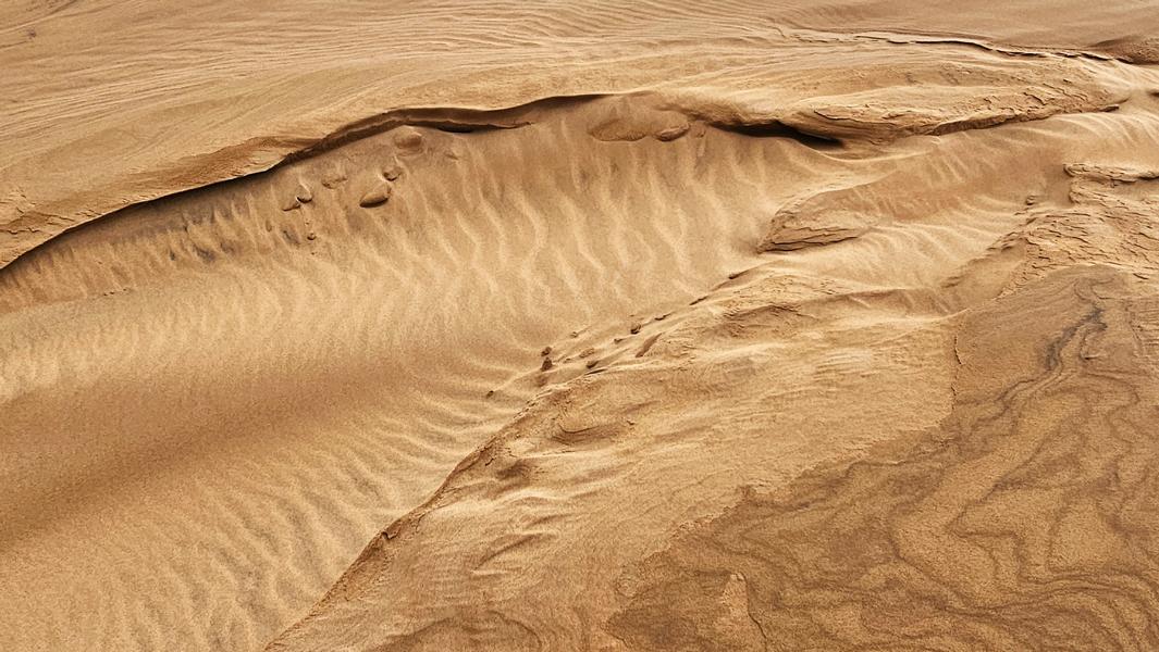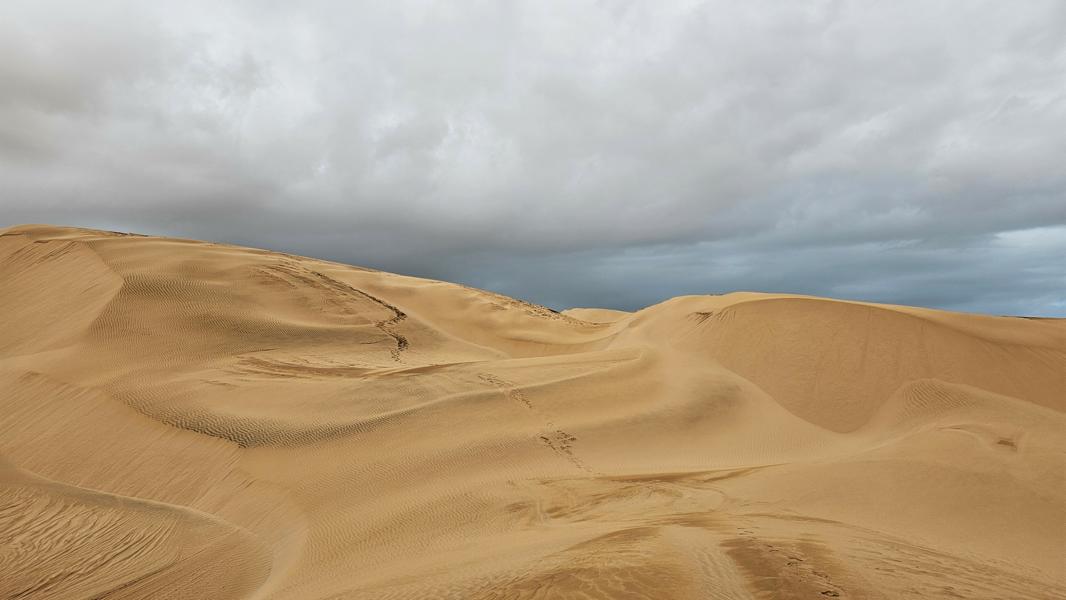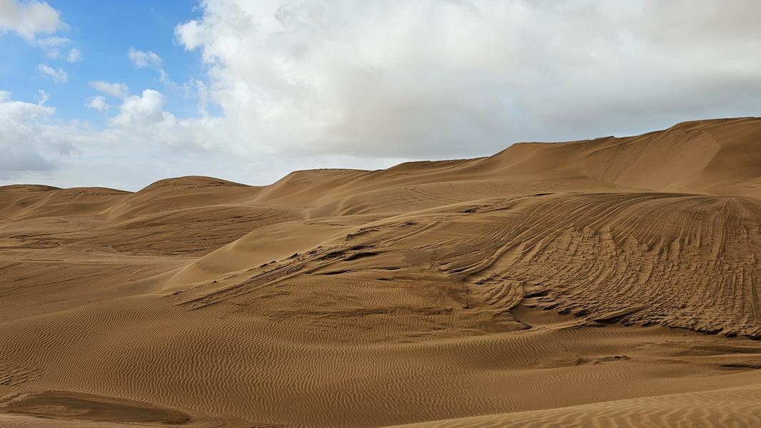 Genug der Assoziationen und zurück zu gestern und meiner schönen Dünenkrabbelei. Kein Menschlein weit und breit und so kann ich den Sand und seine Malereien aus vollen Zügen genießen. An steilen Stücken drei Schritte vor und zwei zurück. Es sind nur kurze weichsandige Passagen. Durch die viele Feuchtigkeit ist der Sand meistens fest und ich kann in Gemütsruhe den Ausblick genießen, die Dünenkämme entlang laufen. Einfach nur schön!